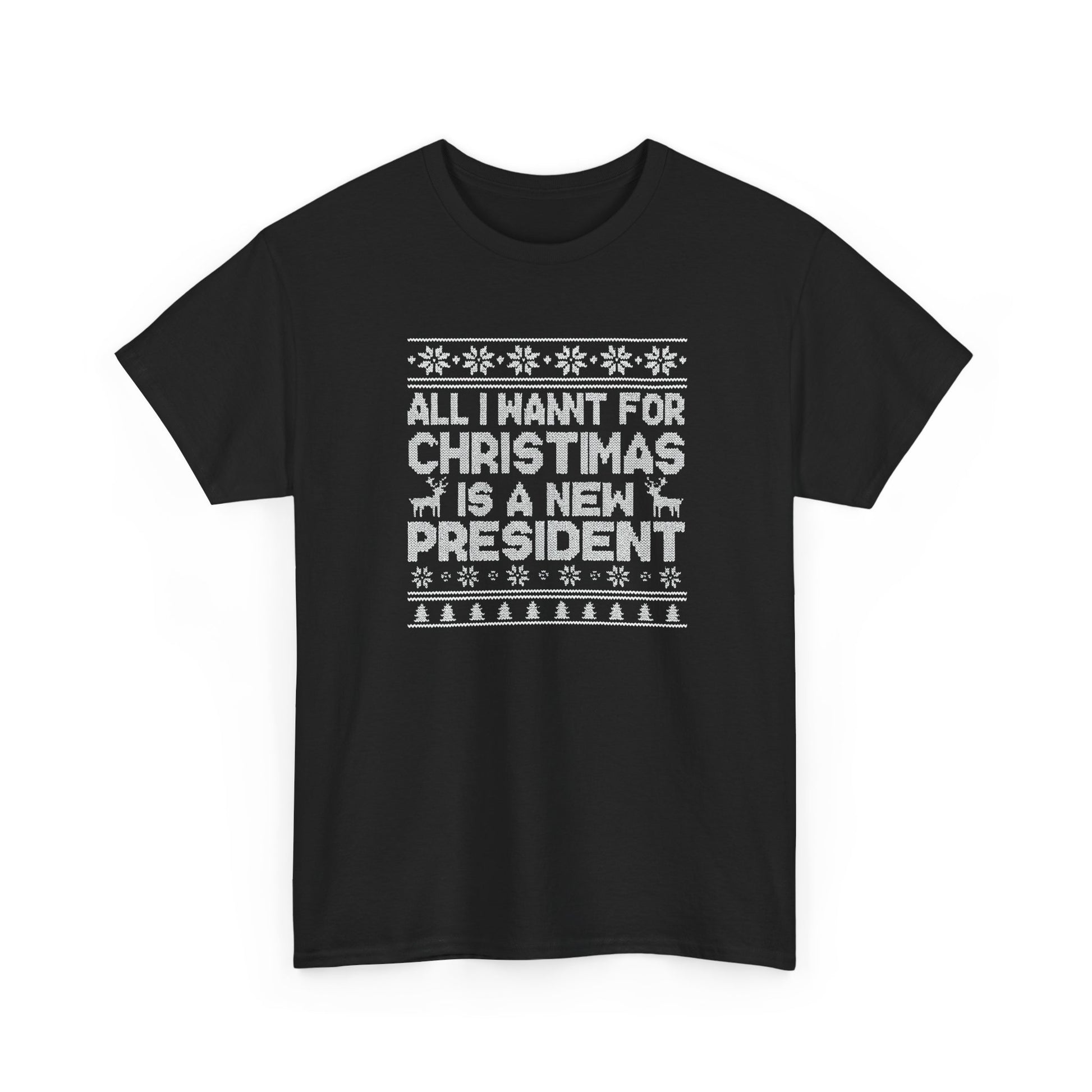 Make your holiday statement loud, clear, and just a little cheeky with this All I Want for Christmas Is a New President T-Shirt. Styled like a festive knit sweater, the bold white print pops against the deep black cotton — turning a classic crewneck into equal parts political commentary and holiday humor.
