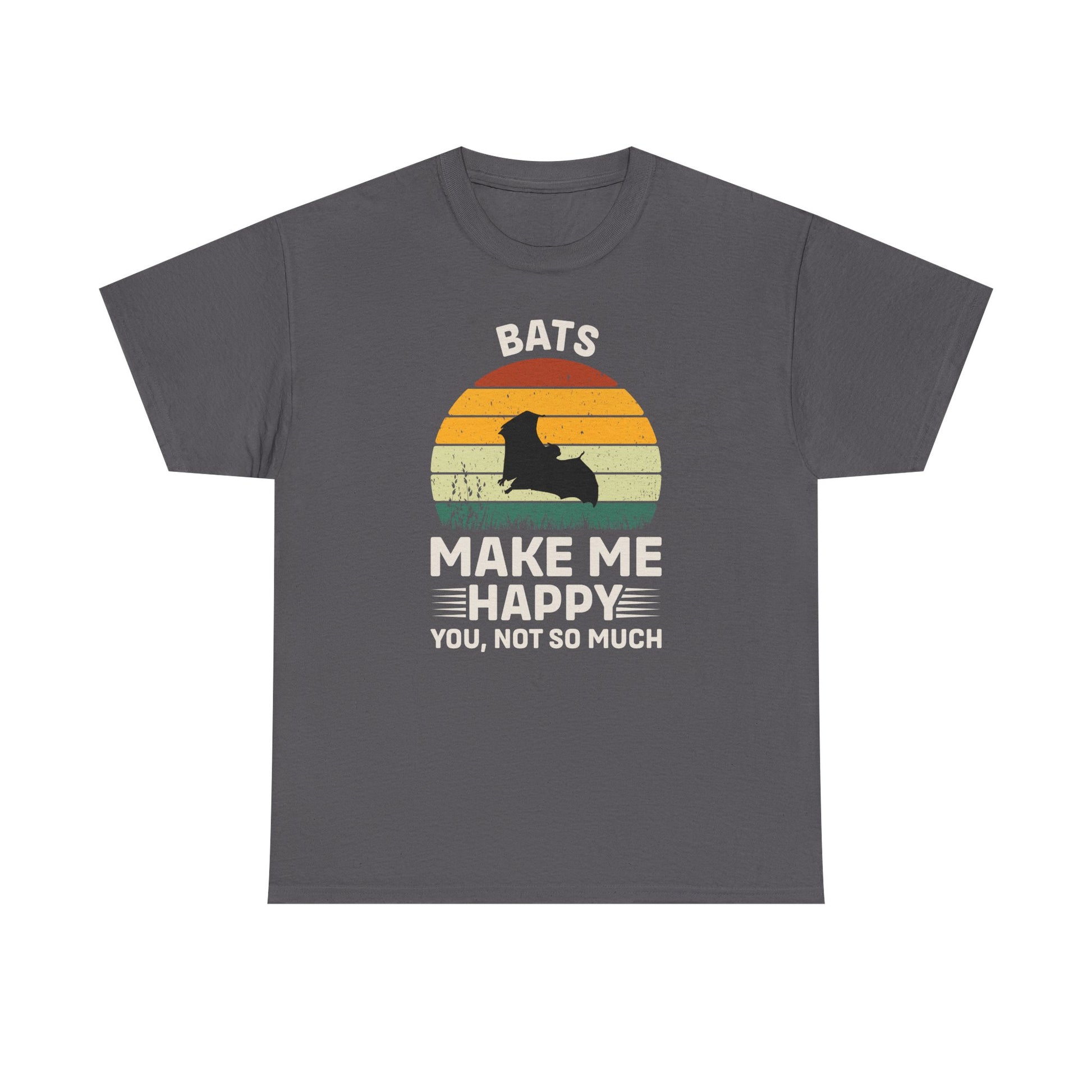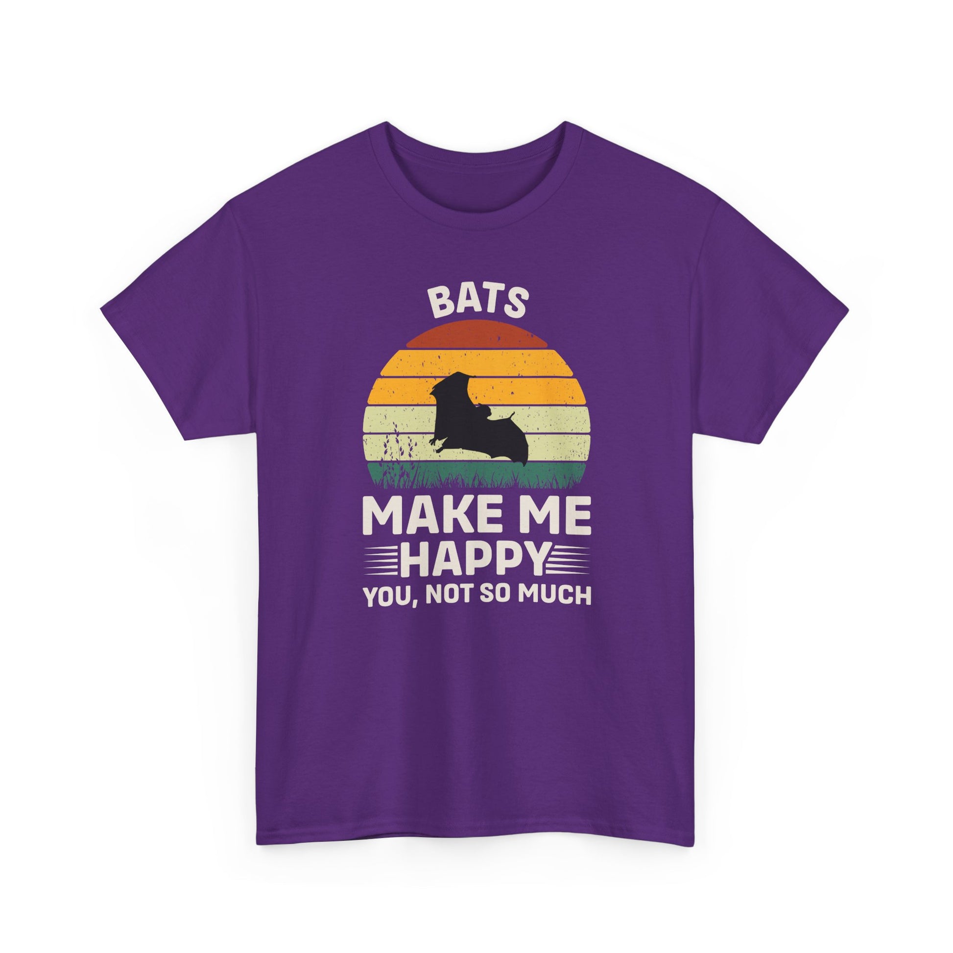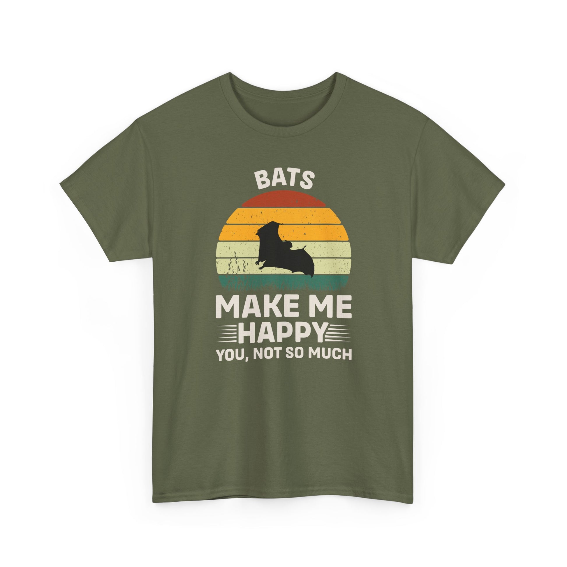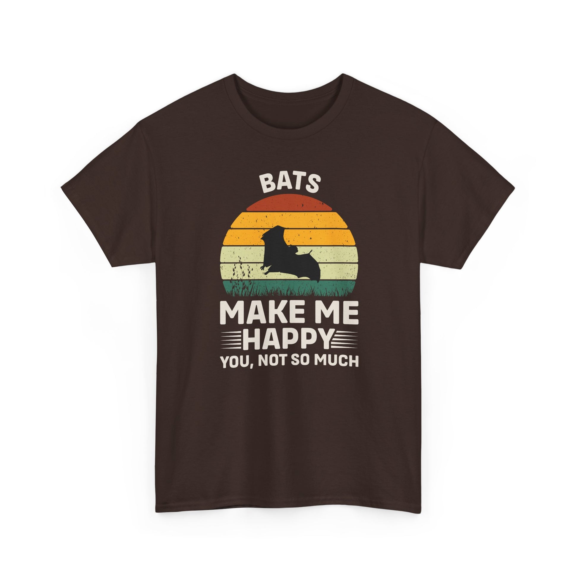 Funny Graphic Tee with the message 'Bats Make Me Happy'. Perfect for Halloween apparel or everyday casual wear. Suitable for lovers of nature and those who appreciate a touch of humor in their wardrobe.