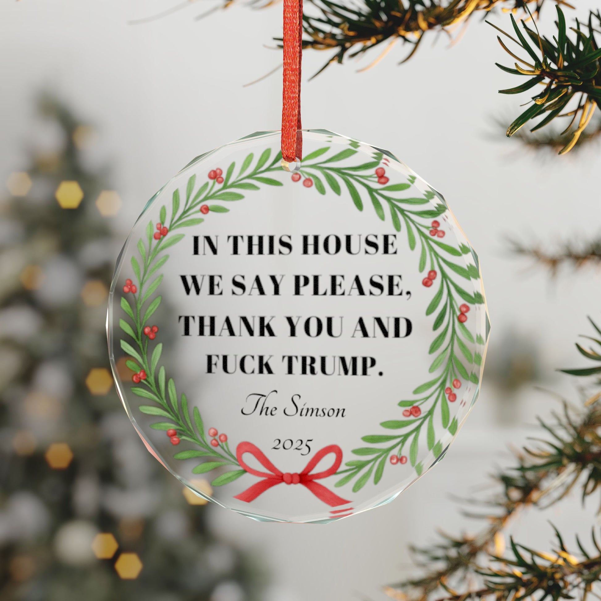 Custom Anti Trump Ornament made of 100% Crystal glass with a one-sided print. Perfect Christmas gift for liberals who want to add a touch of humor and resistance to their holiday decor.