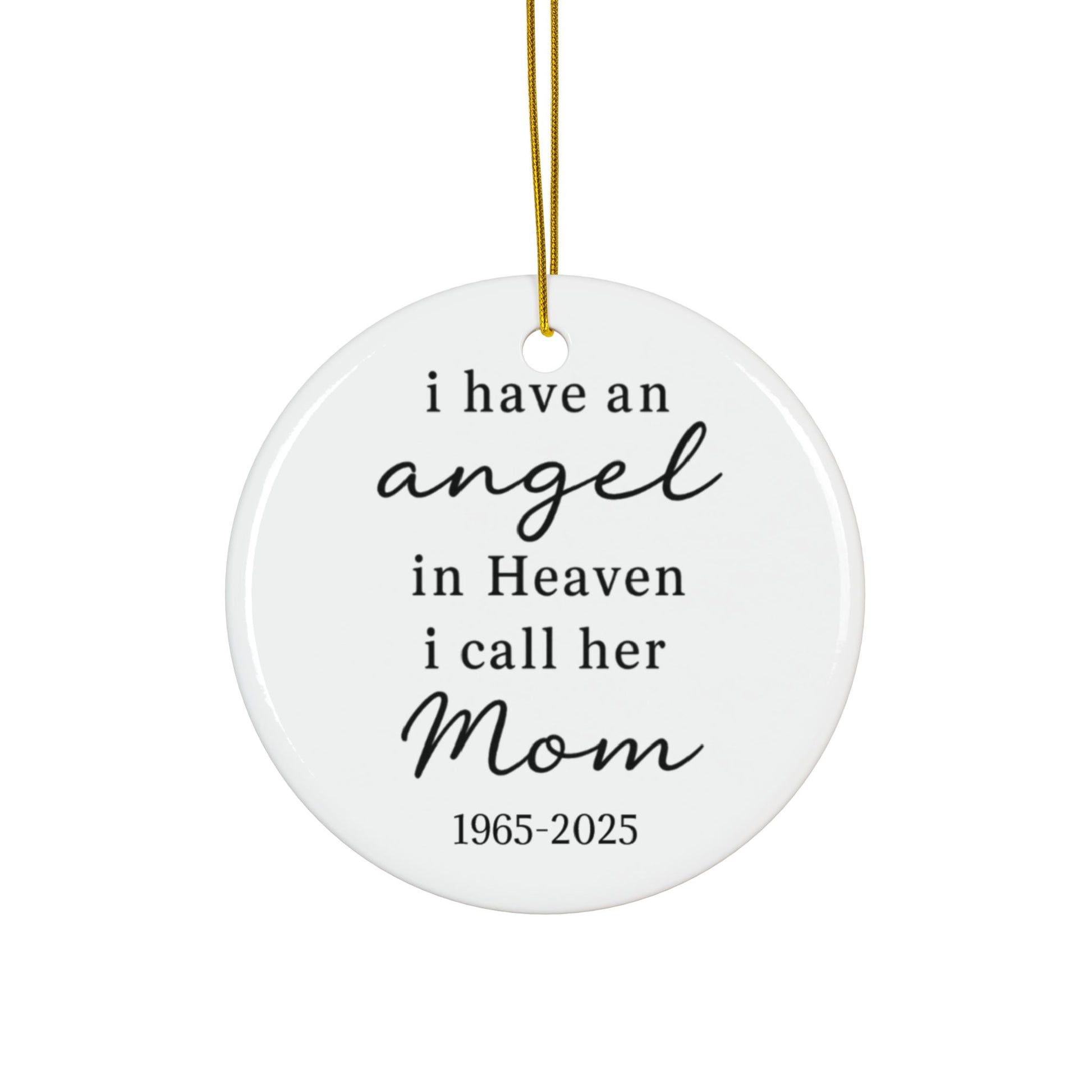 Honor the memory of a beloved mother with a keepsake designed to bring comfort through every season. This custom Mom memorial ornament features a clean white ceramic base, crisp black lettering, and the tender message: “I have an angel in Heaven, I call her Mom.” Personalized dates can be added beneath the phrase to create a meaningful tribute that feels uniquely yours.