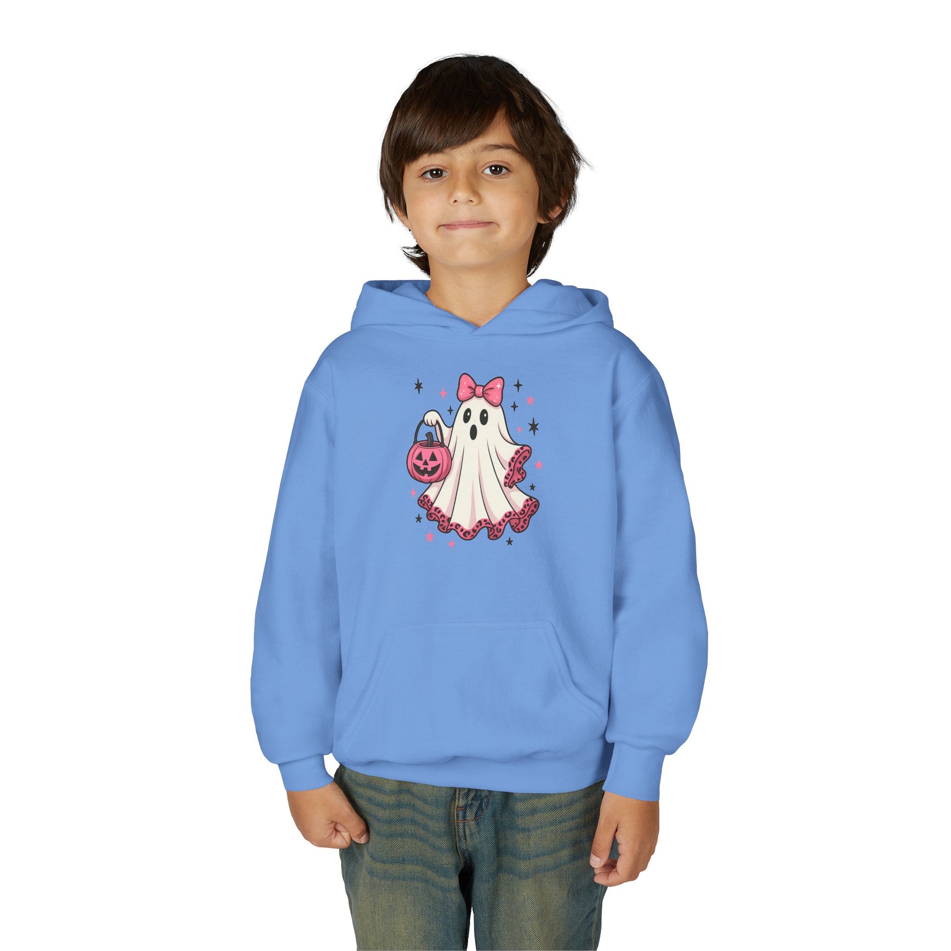 Introducing a cozy and fun Youth Heavy Blend Hooded Sweatshirt that combines warmth and style into one delightful package. This sweatshirt features an adorable ghost design that captures the spirit of Halloween, making it a perfect addition to your young one's wardrobe for spooky season festivities! Imagine your kids wearing this cheerful hoodie while trick-or-treating or attending Halloween parties—it's bound to spark joy and excitement! This product is ideal for children who love playful and festive attire. Plus, it makes a fantastic gift for birthdays, Halloween, or even as a seasonal treat. For dressing up or lounging around the house, this sweatshirt is a must-have for your child's casual looks during cooler days.