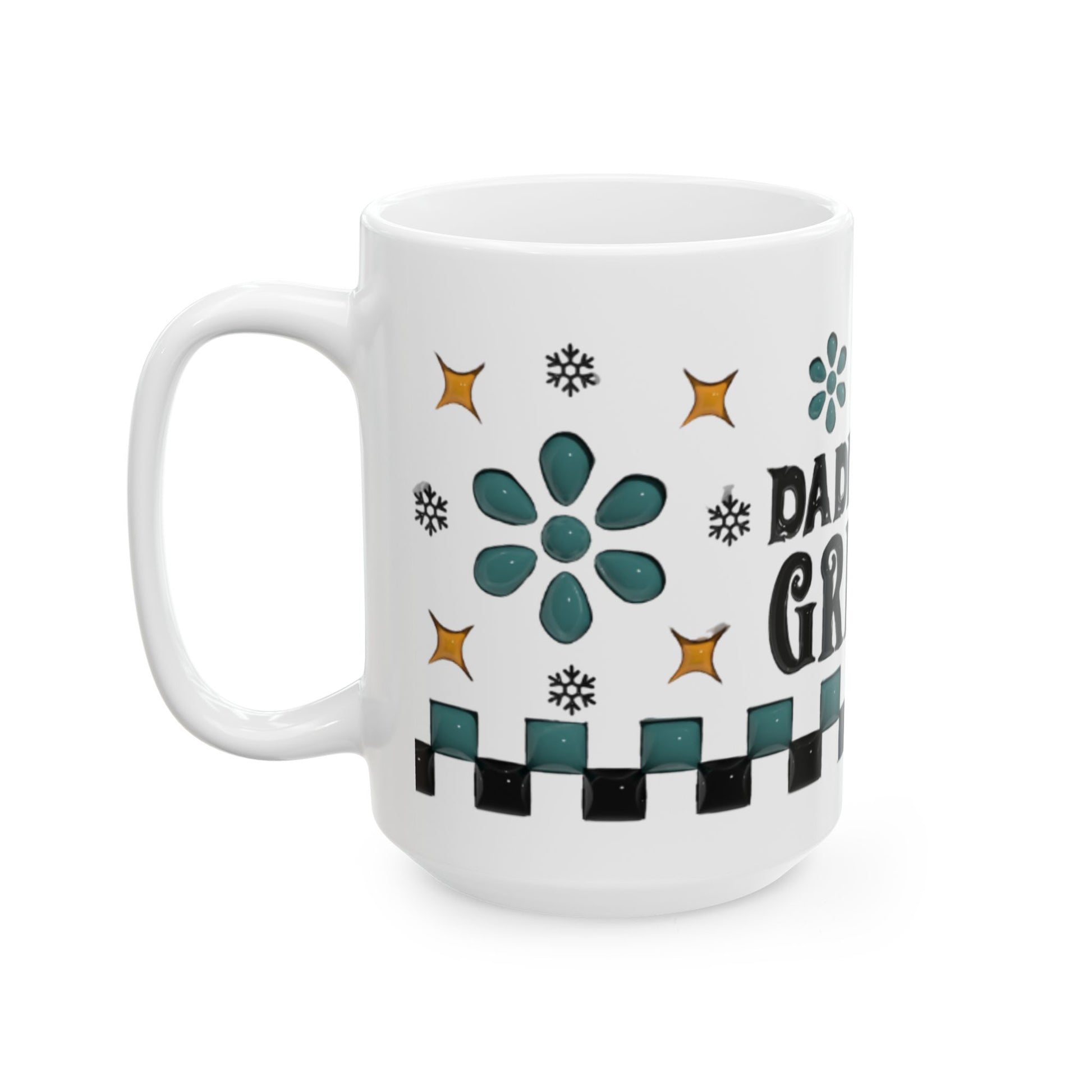 Bring a little mischievous cheer to Christmas mornings with this Daddy Grinch mug — a glossy ceramic cup designed for dads who love holiday humor. The bold black lettering, jaunty Santa hat, retro stars, snowflakes, and checker border blend together for a fun design that feels festive without going over the top.