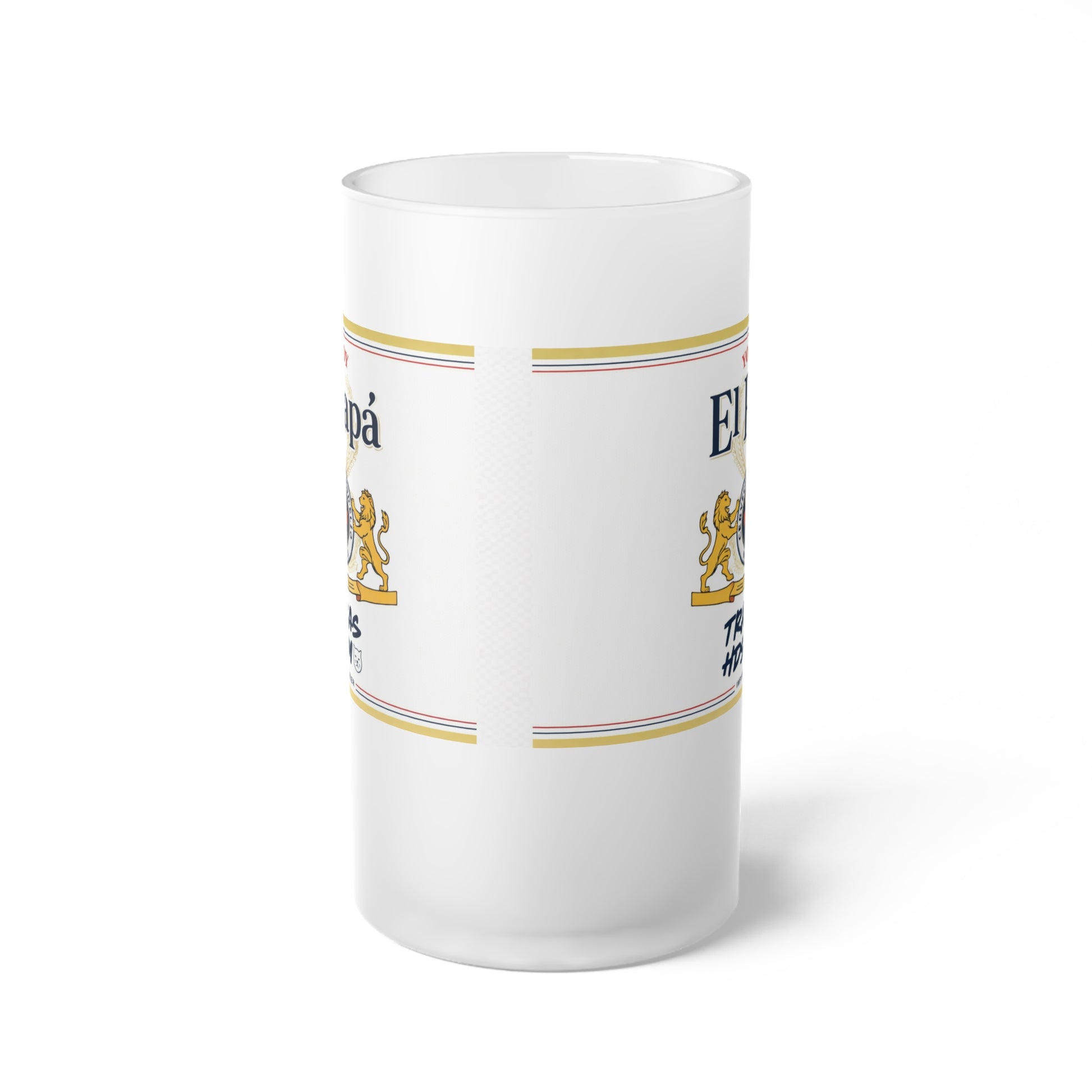 Cold glass, warm memories. This Estrella-style frosted glass beer mug brings old-world Spanish brewery charm into everyday moments. The soft matte finish diffuses light beautifully, allowing the colors of the wraparound label design to glow subtly from every angle.
