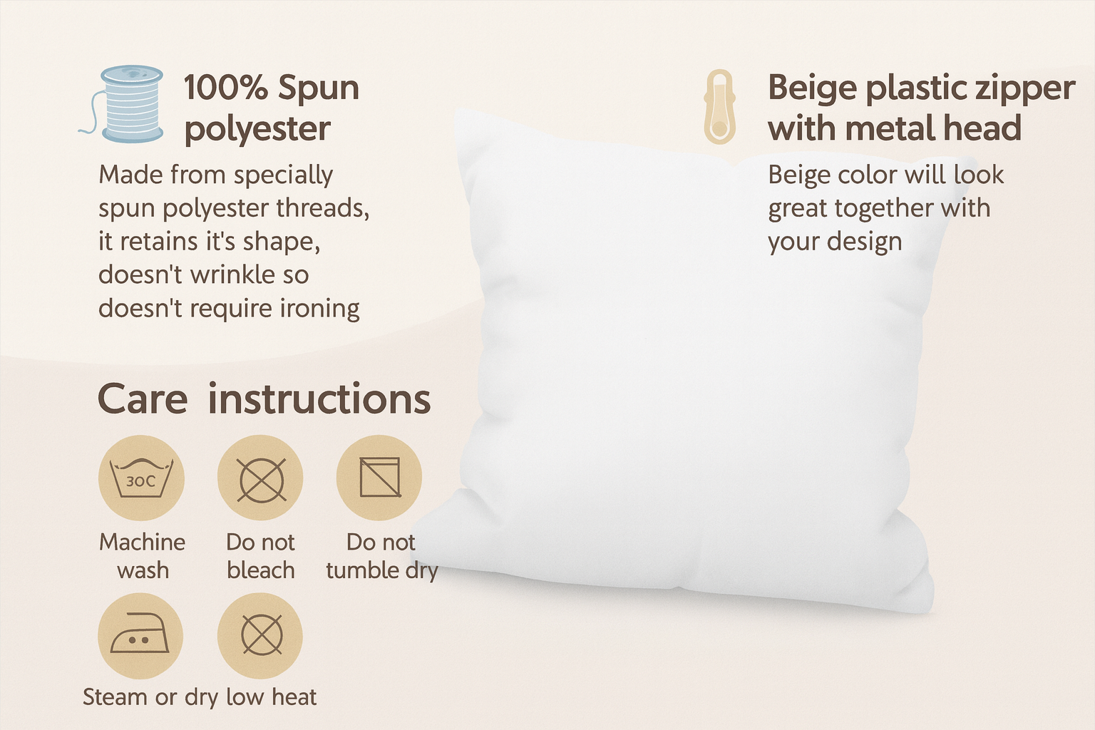 Remove cover if detachable. Pre-treat stains with a soft cloth or brush soaked in warm soapy water. Machine wash at 40°C (normal cycle). Do not bleach. Do not tumble dry. Iron, steam, or dry on low heat only. Do not dry-clean. Fluff pillow after reassembling for best shape.