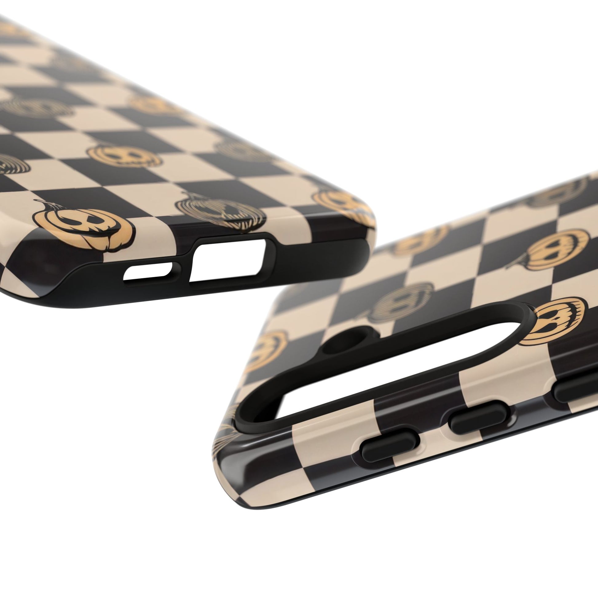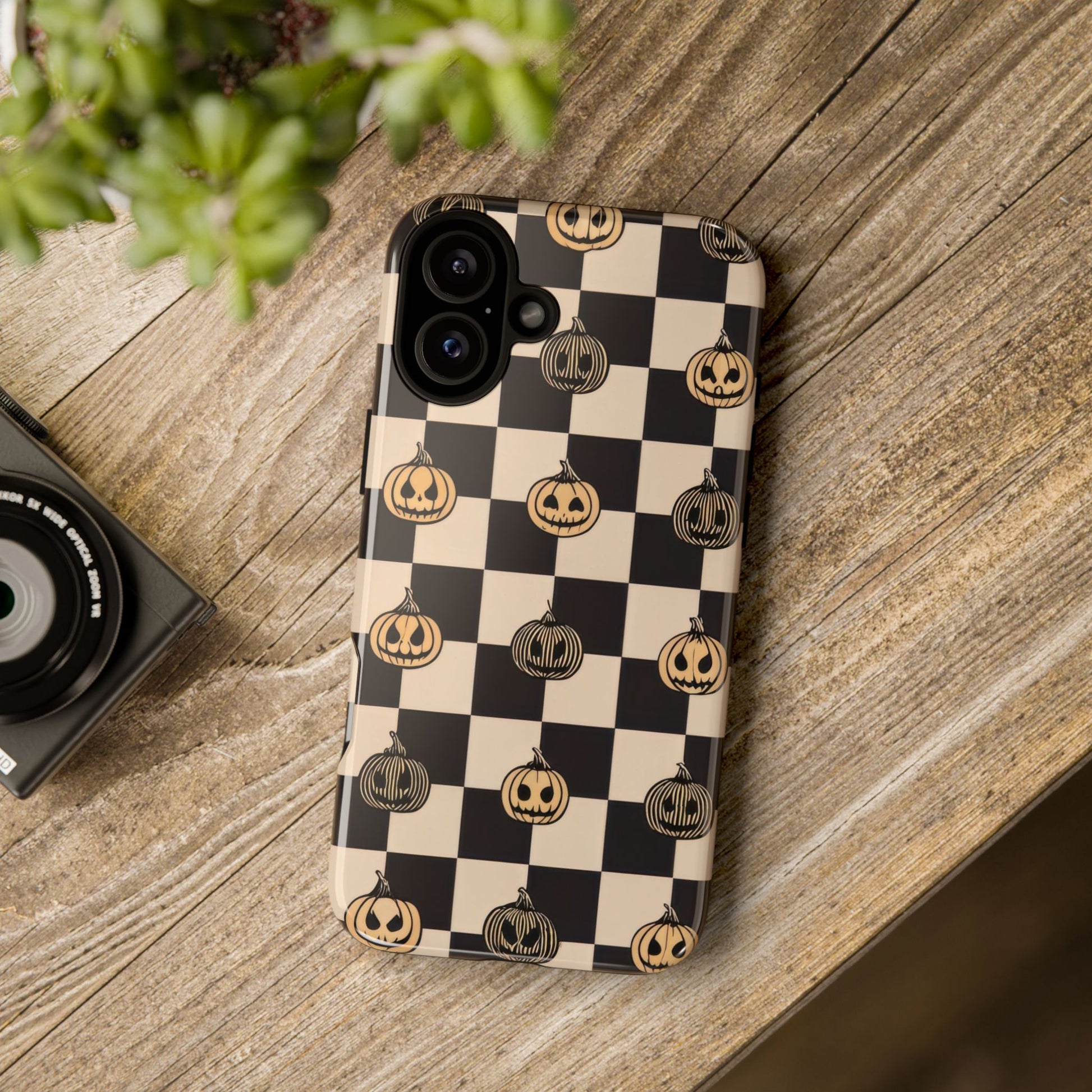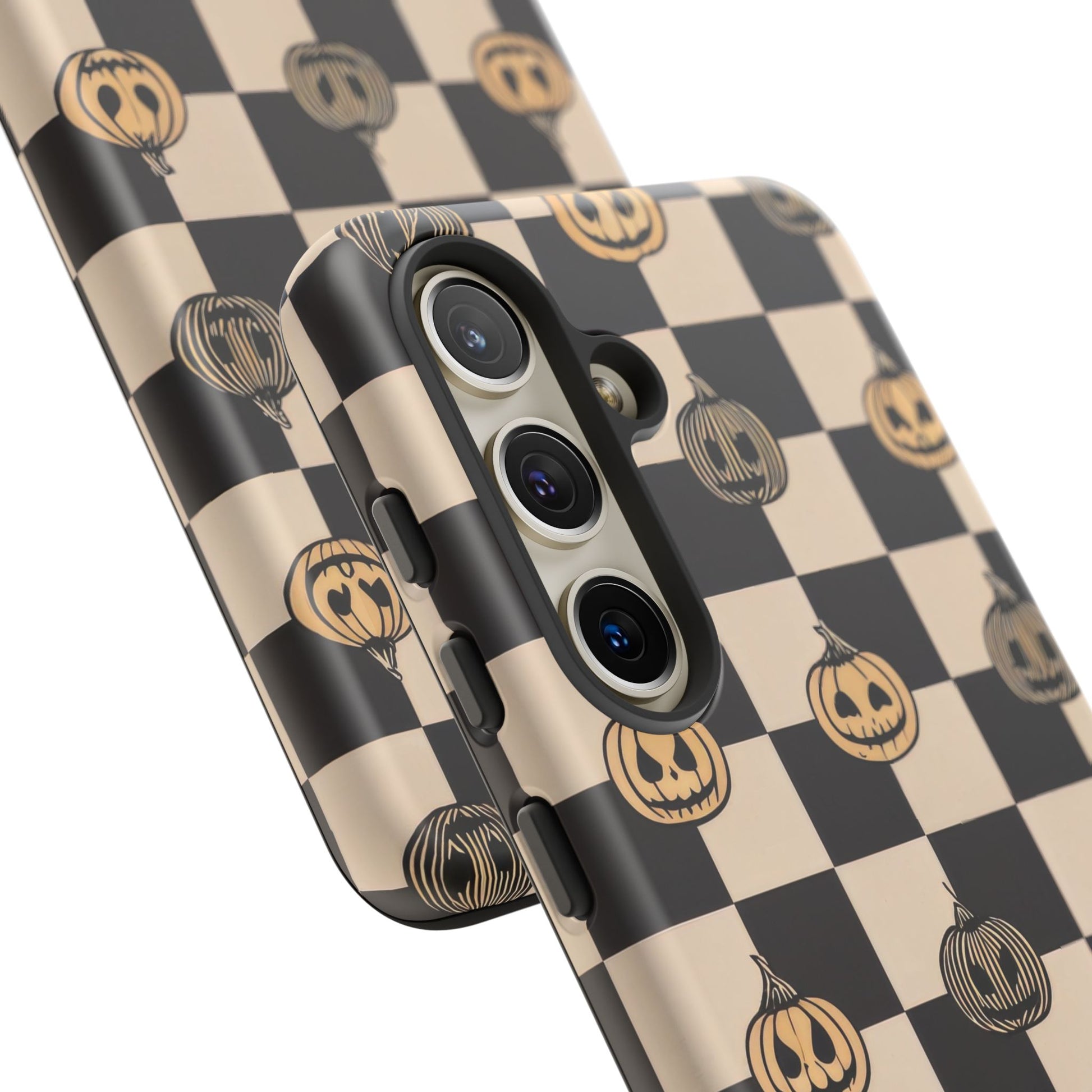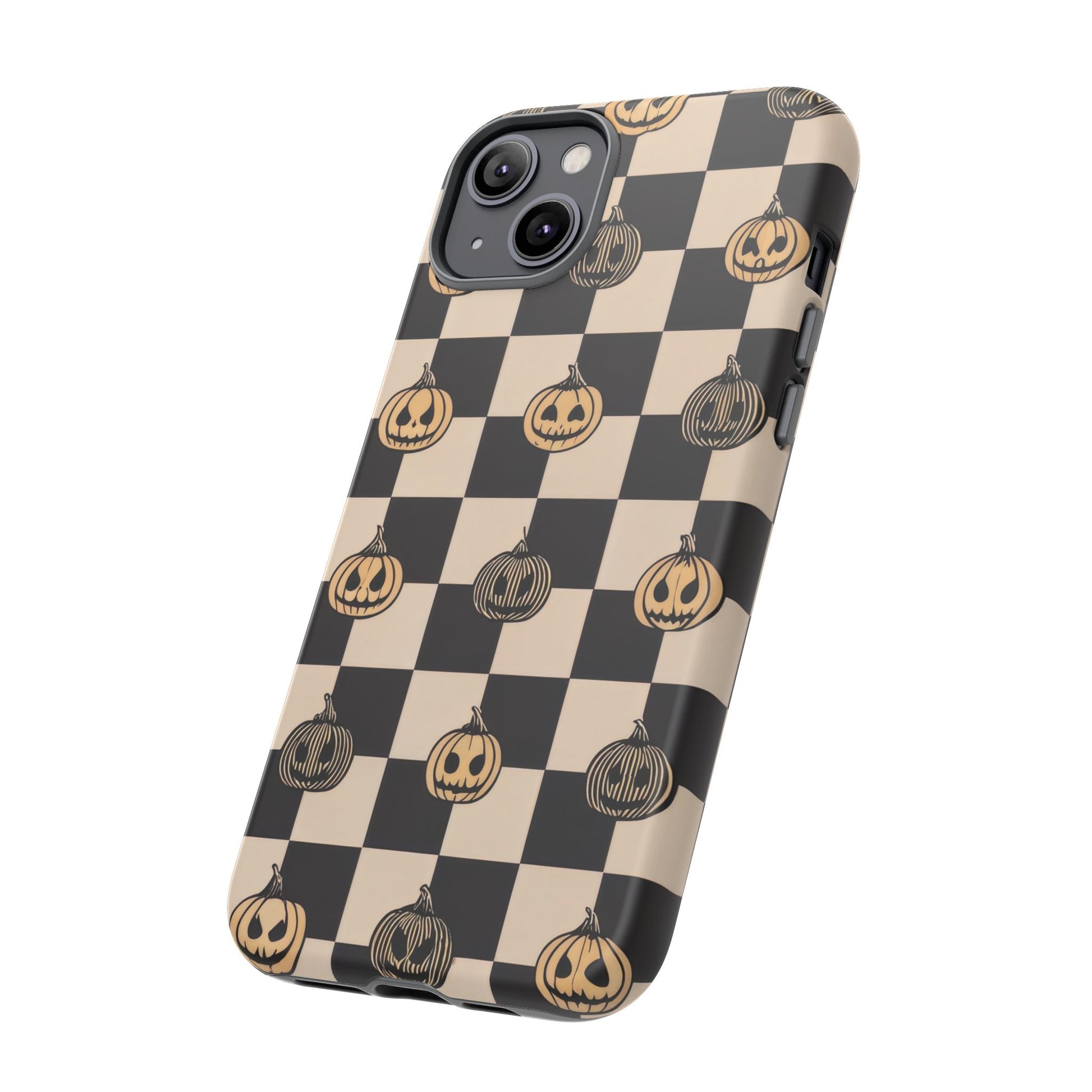 Introducing the perfect accessory for smartphone lovers: our durable phone case. Designed for those who appreciate both style and protection, this case features a striking black and beige checkerboard pattern adorned with whimsical pumpkin illustrations, capturing a festive spirit that’s perfect for fall. It’s not just a phone case; it’s a statement piece ideal for Halloween celebrations or seasonal festivities. Whether you're heading to a themed party or simply want to express your love for autumn, this case fits seamlessly into your lifestyle. It's a great gift for friends and family who enjoy unique, eye-catching designs and practicality in their everyday accessories.