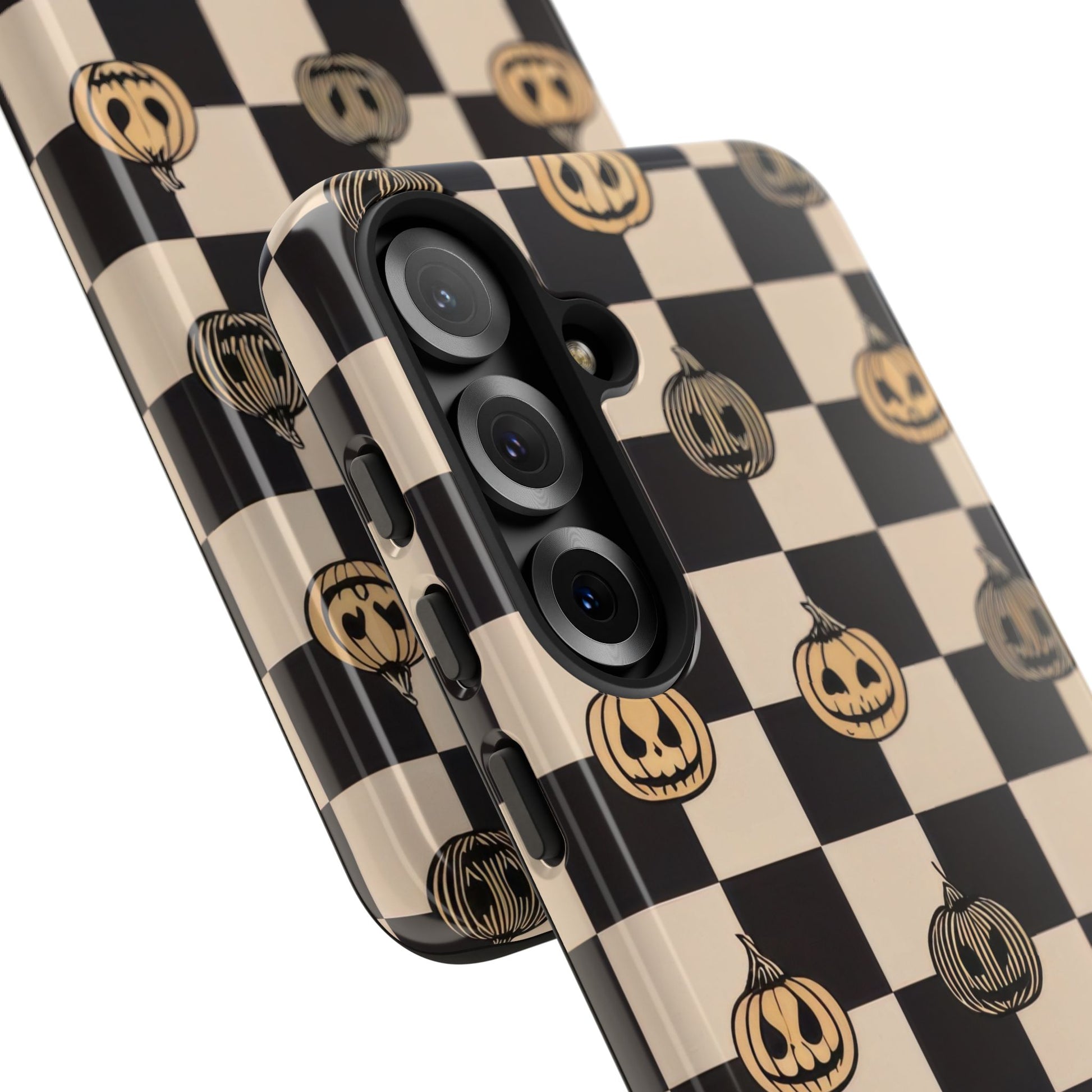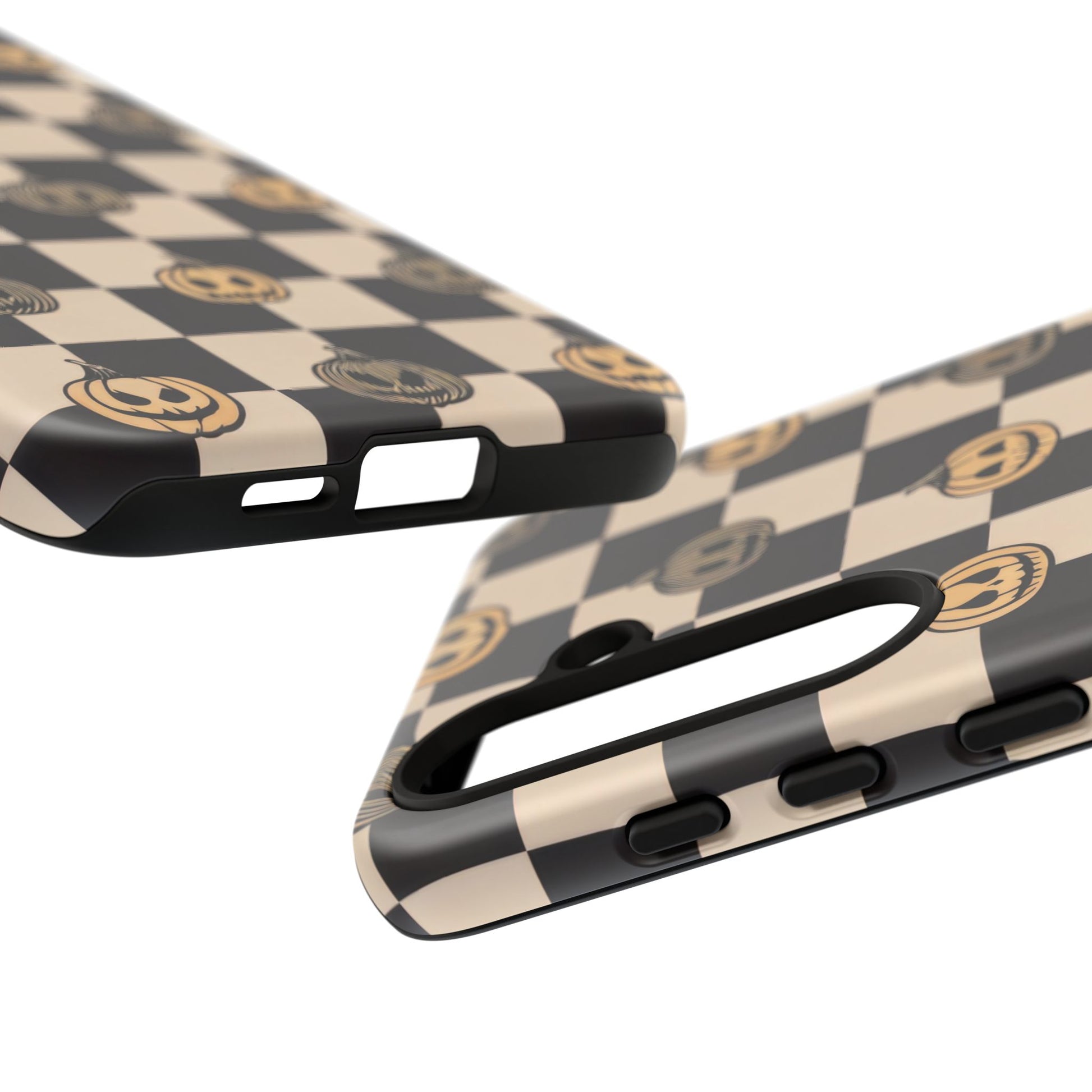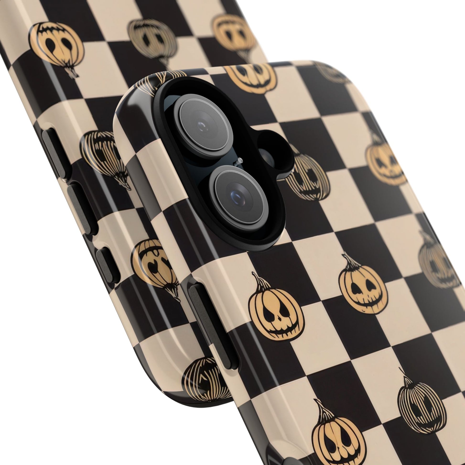 Introducing the perfect accessory for smartphone lovers: our durable phone case. Designed for those who appreciate both style and protection, this case features a striking black and beige checkerboard pattern adorned with whimsical pumpkin illustrations, capturing a festive spirit that’s perfect for fall. It’s not just a phone case; it’s a statement piece ideal for Halloween celebrations or seasonal festivities. Whether you're heading to a themed party or simply want to express your love for autumn, this case fits seamlessly into your lifestyle. It's a great gift for friends and family who enjoy unique, eye-catching designs and practicality in their everyday accessories.