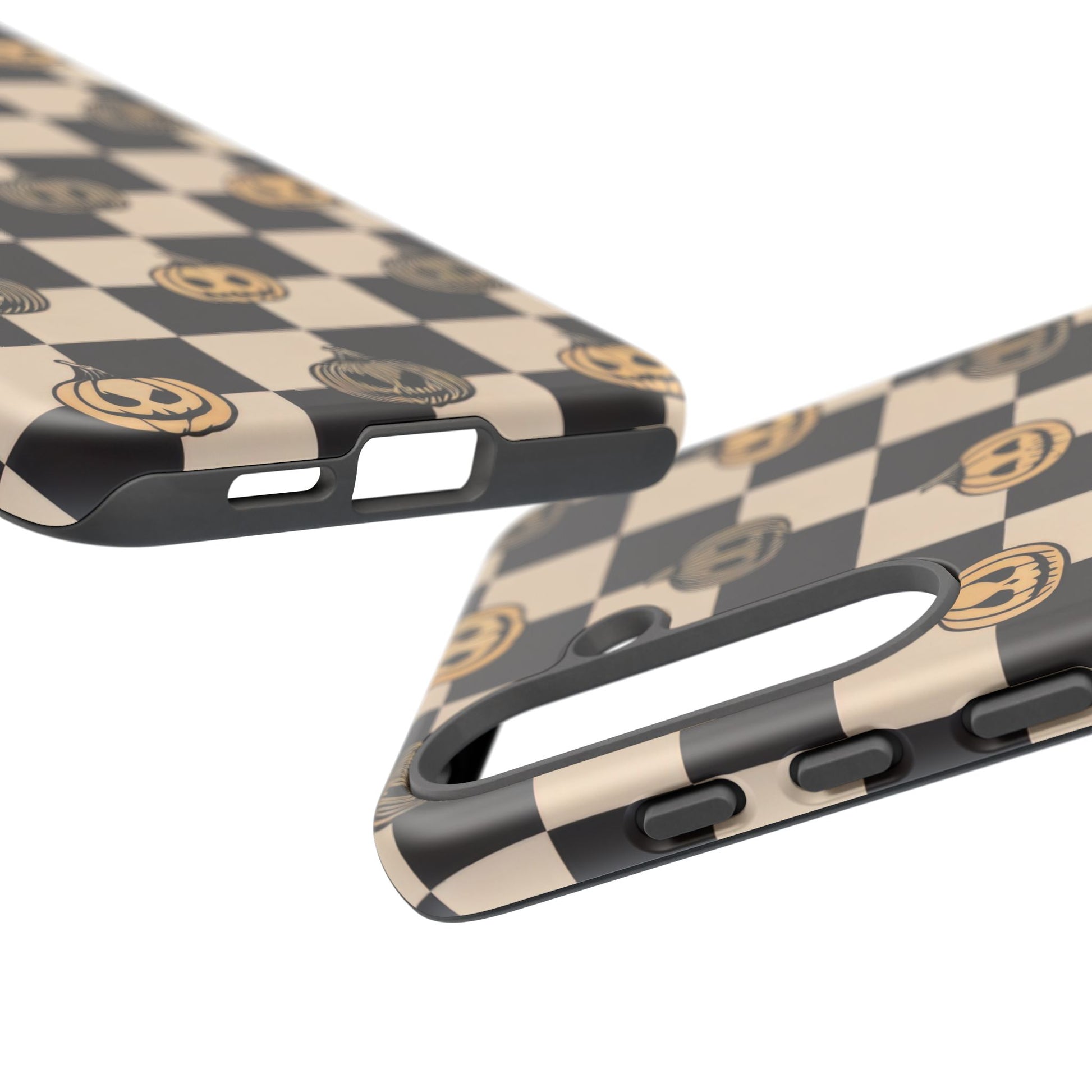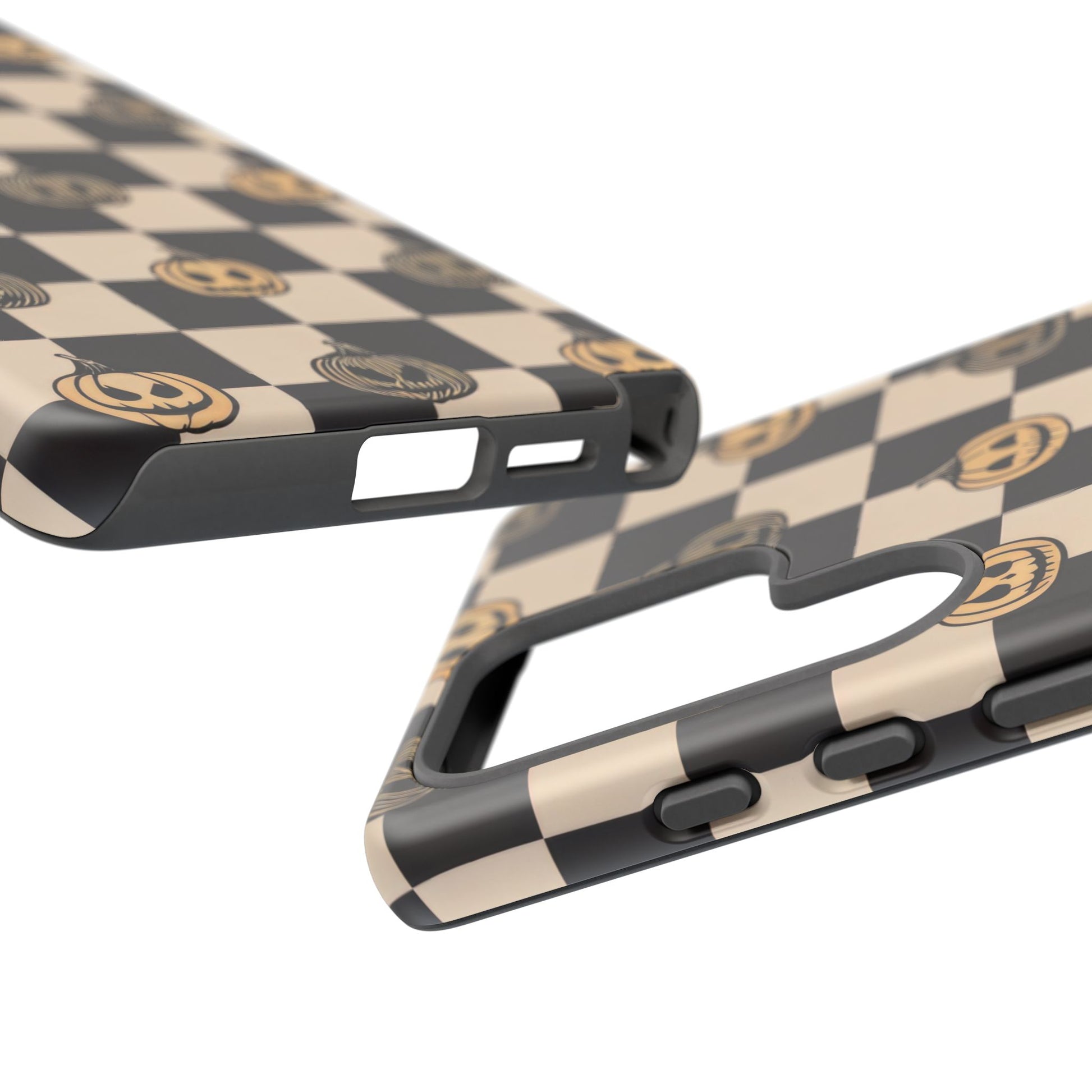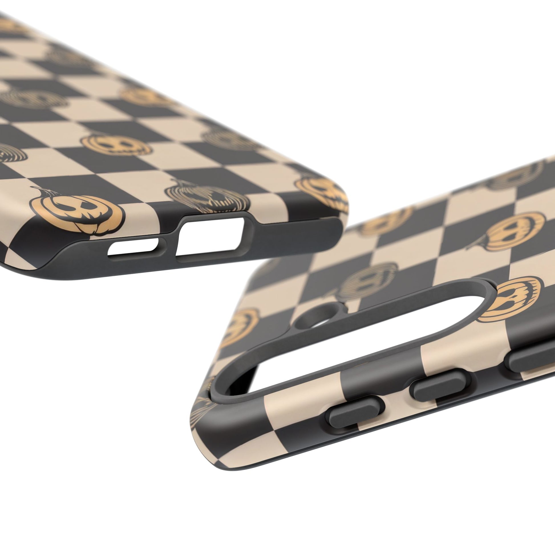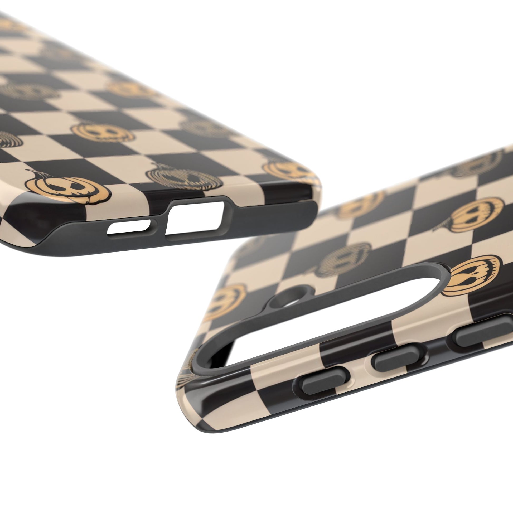 Introducing the perfect accessory for smartphone lovers: our durable phone case. Designed for those who appreciate both style and protection, this case features a striking black and beige checkerboard pattern adorned with whimsical pumpkin illustrations, capturing a festive spirit that’s perfect for fall. It’s not just a phone case; it’s a statement piece ideal for Halloween celebrations or seasonal festivities. Whether you're heading to a themed party or simply want to express your love for autumn, this case fits seamlessly into your lifestyle. It's a great gift for friends and family who enjoy unique, eye-catching designs and practicality in their everyday accessories.