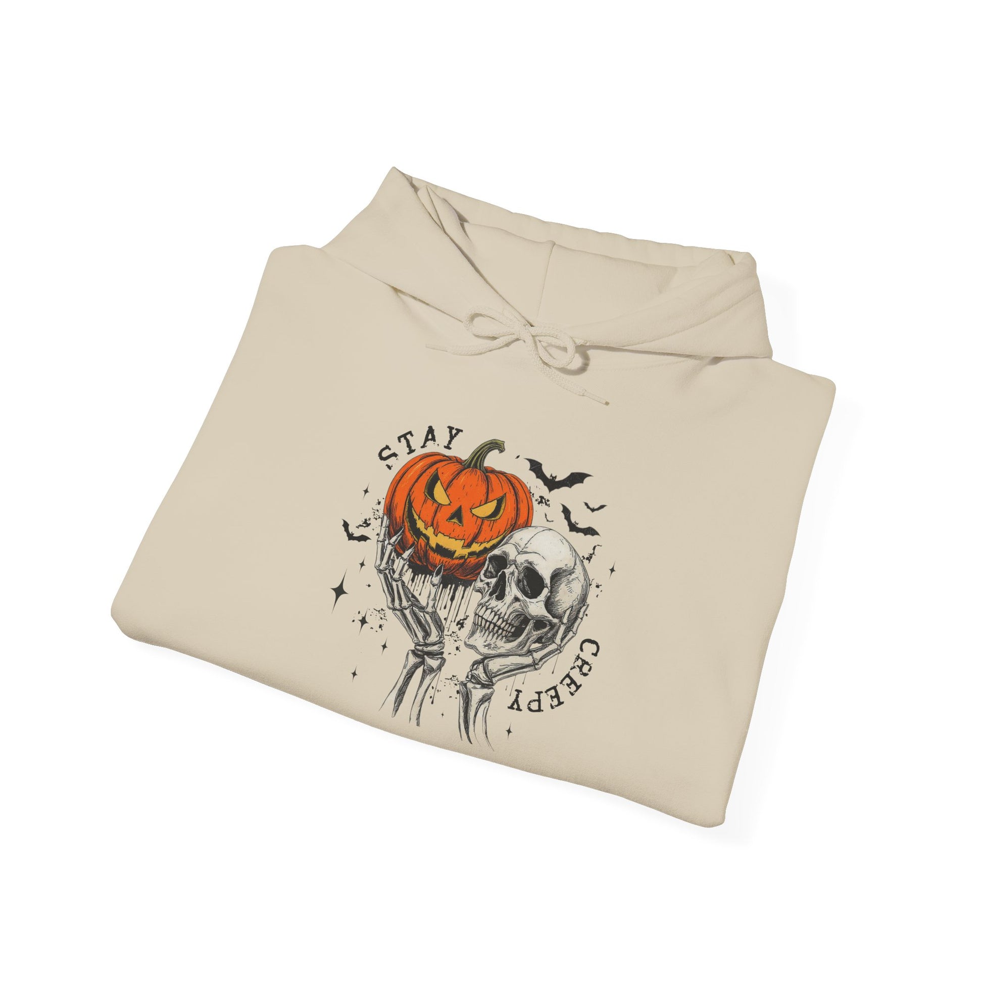Cozy Halloween Pumpkin & Skull Hooded Sweatshirt, perfect for Fall fashion. This spooky gift is ideal for Halloween Day celebrations and Halloween enthusiasts. The hoodie gives off a cozy and festive vibe, making it a must-have for the holiday season.
