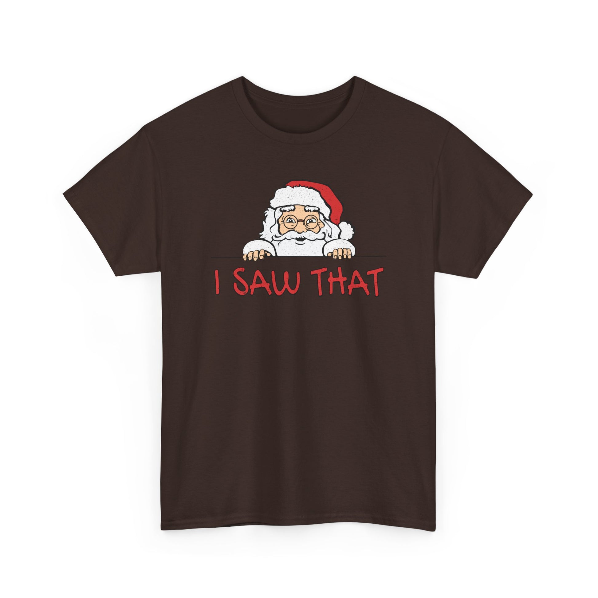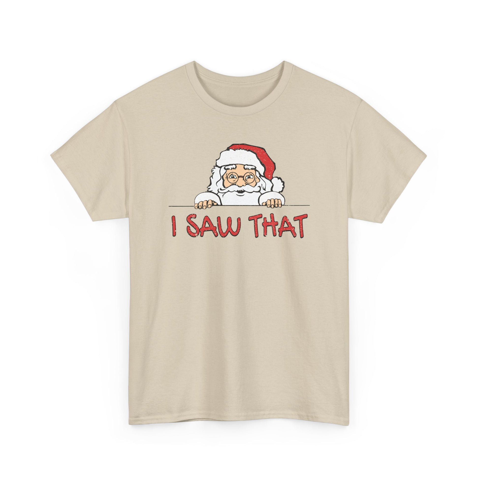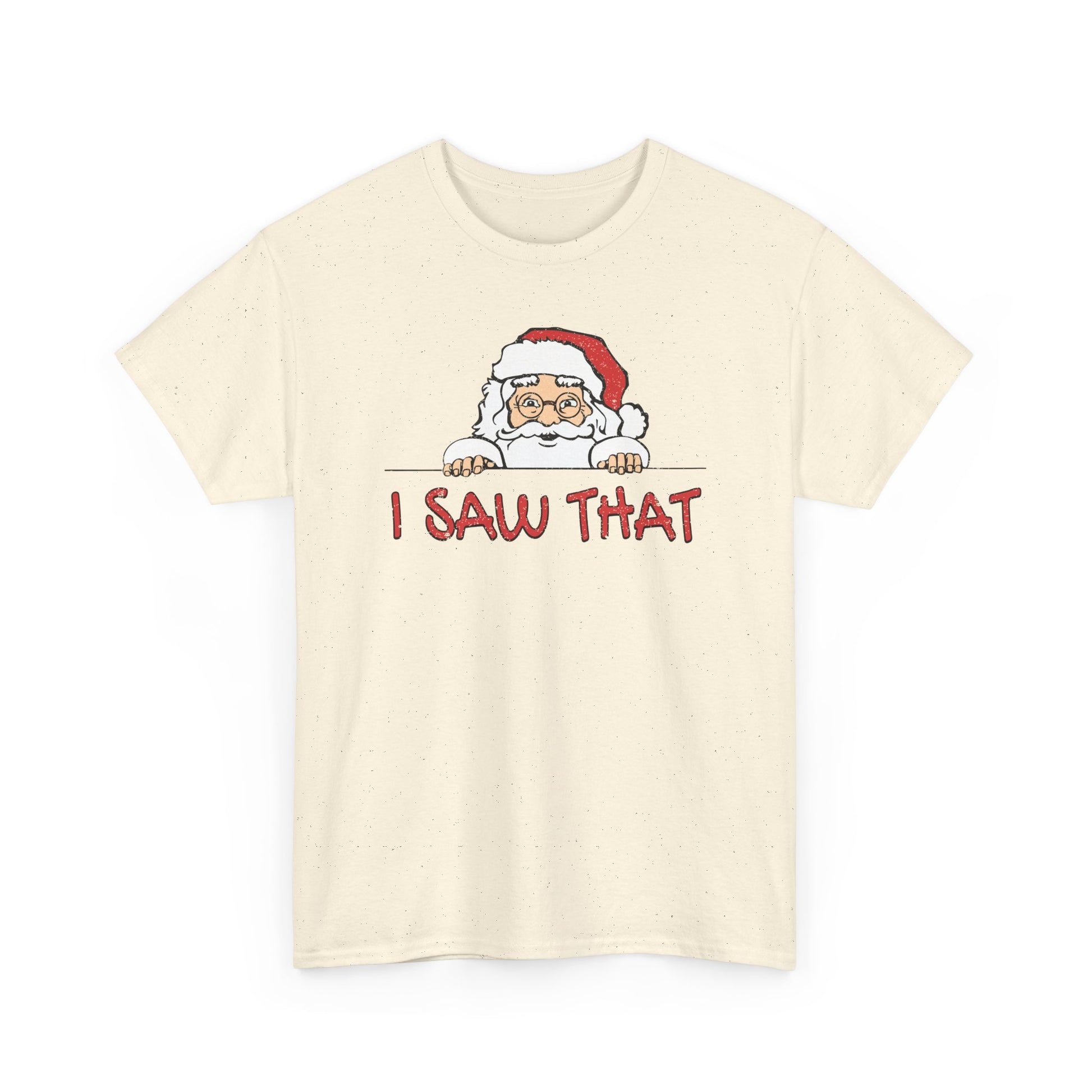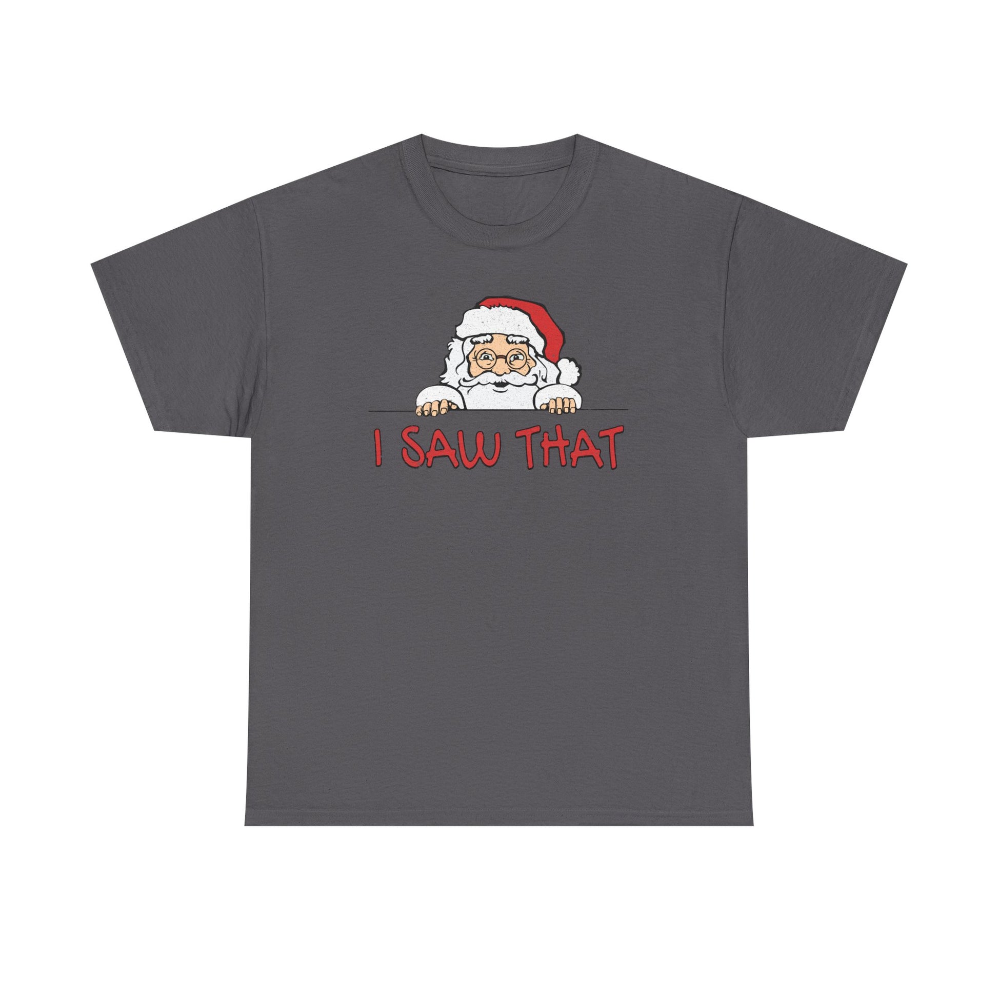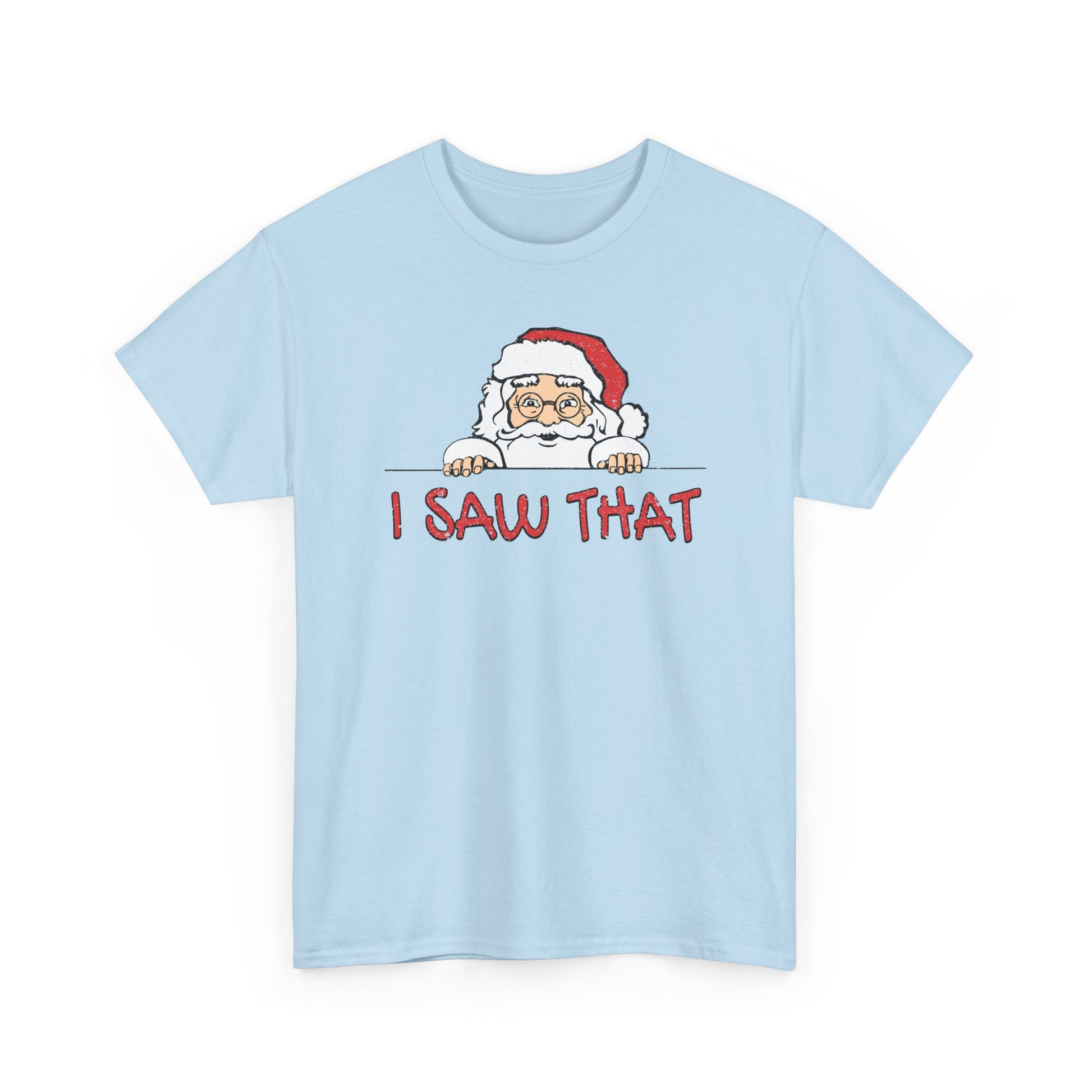 Keep your holiday spirit bright (and a little mischievous) with this “I Saw That” Santa T-Shirt — featuring a cheeky Santa peeking around the corner just in time to catch you on his naughty list!