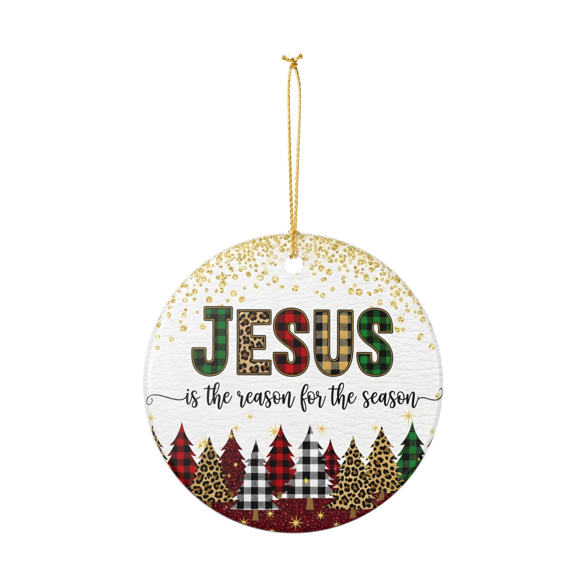 Celebrate the true meaning of Christmas with this beautifully designed “Jesus Is the Reason for the Season” ceramic ornament. Featuring bold patterned lettering, festive Christmas trees in plaid and leopard print, and shimmering gold accents, this ornament adds a heartfelt touch of faith to your holiday décor.