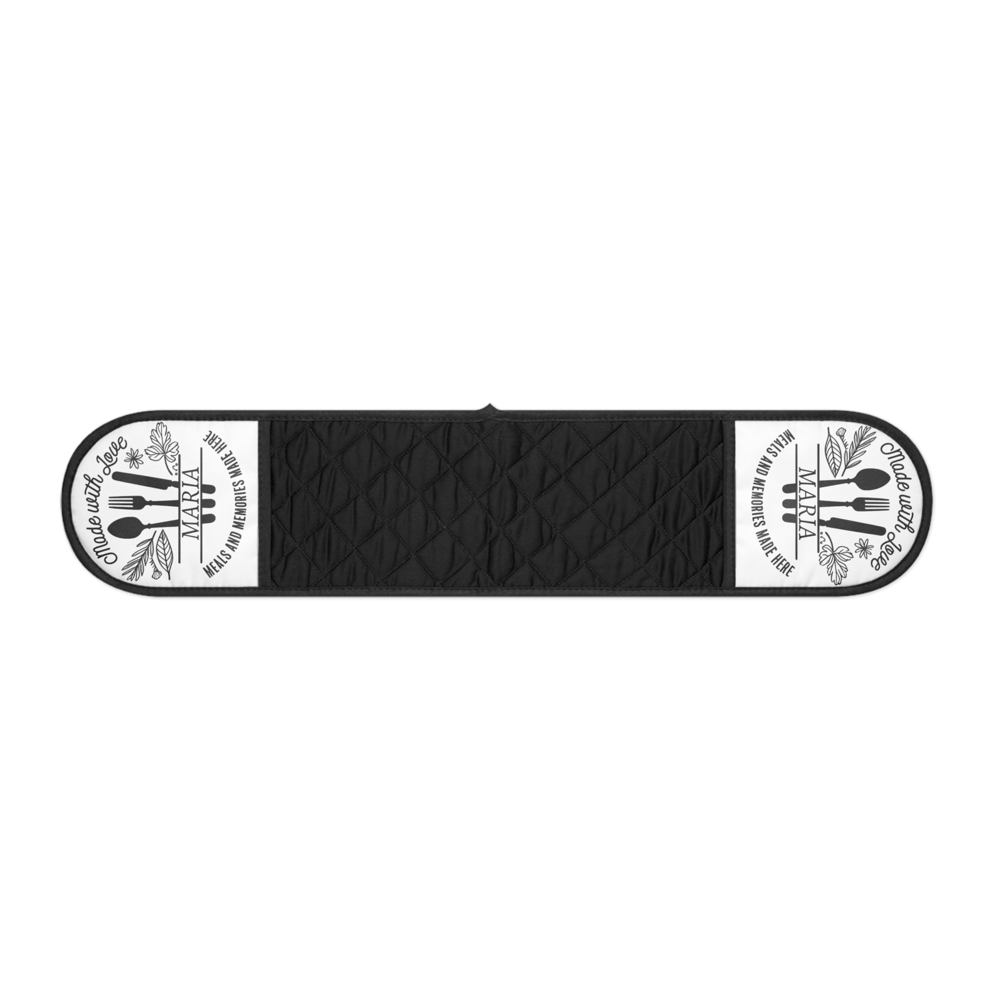 Step into your kitchen with confidence and style using these Kitchen Utensil Circle Oven Mitts. Designed for chefs, bakers, and home cooks alike, these double-padded gloves protect your hands while offering flexibility and control. The quilted black surface provides a sleek, professional look, while the printed end panels add a subtle vintage-kitchen charm.