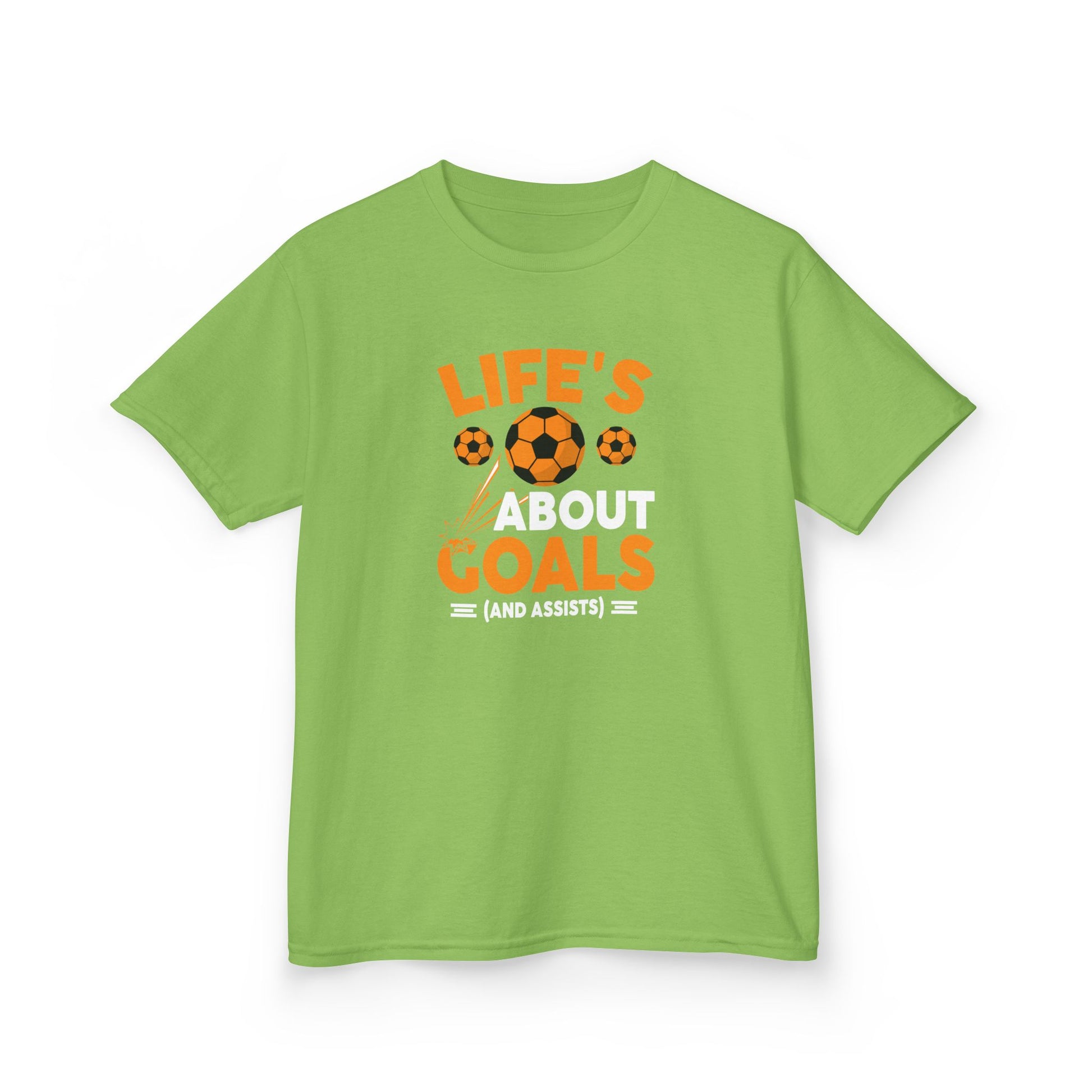 Celebrate every small victory on and off the field with this Life’s About Goals Kids T-Shirt. Featuring bold orange lettering and playful soccer graphics, the shirt reads “LIFE’S ABOUT GOALS (AND ASSISTS)” — a cheeky, kid-friendly nod to teamwork and determination.