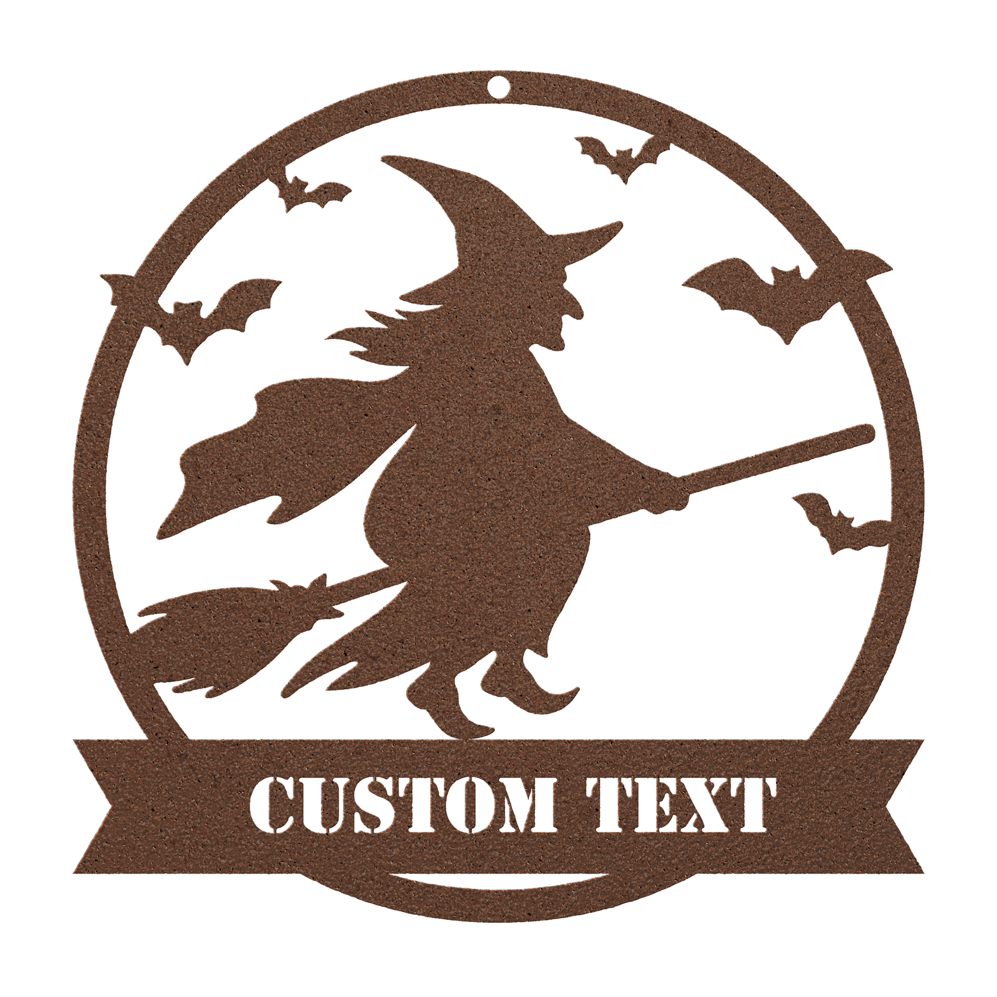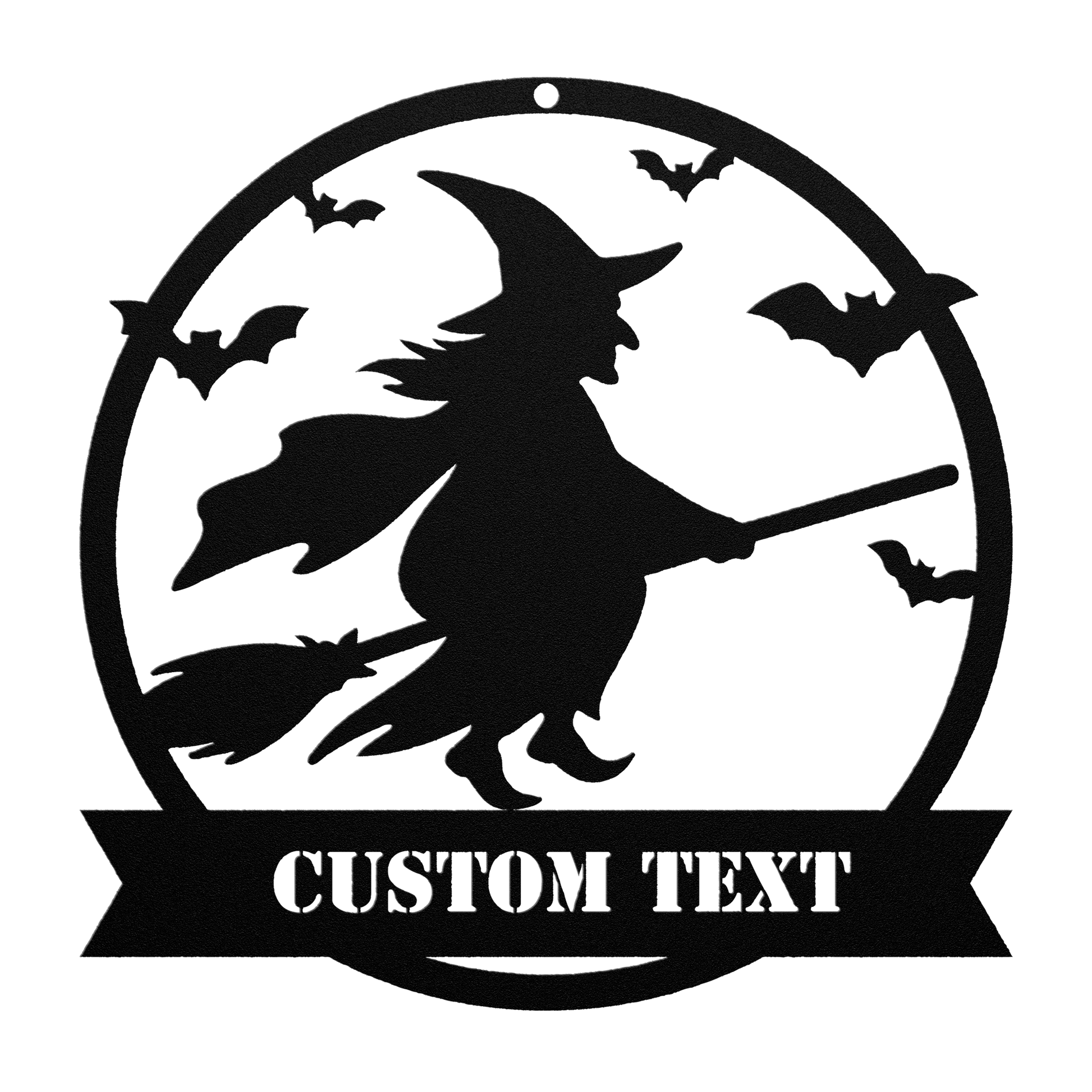 Custom Witch Metal Wall Art Sign – Flying Witch on Broom with Bats Wall Décor Outdoor Indoor Personalized Powder Coated Steel Sign