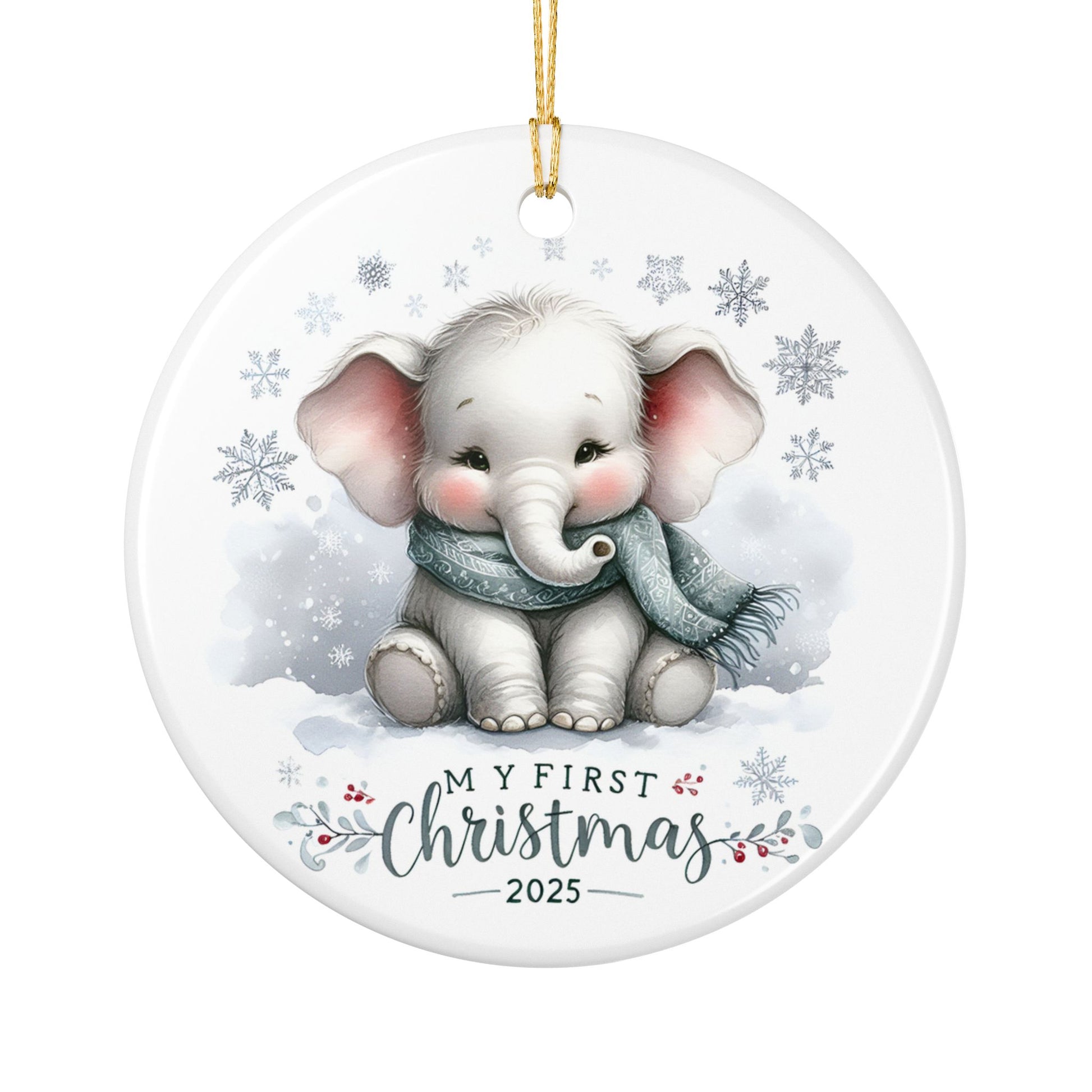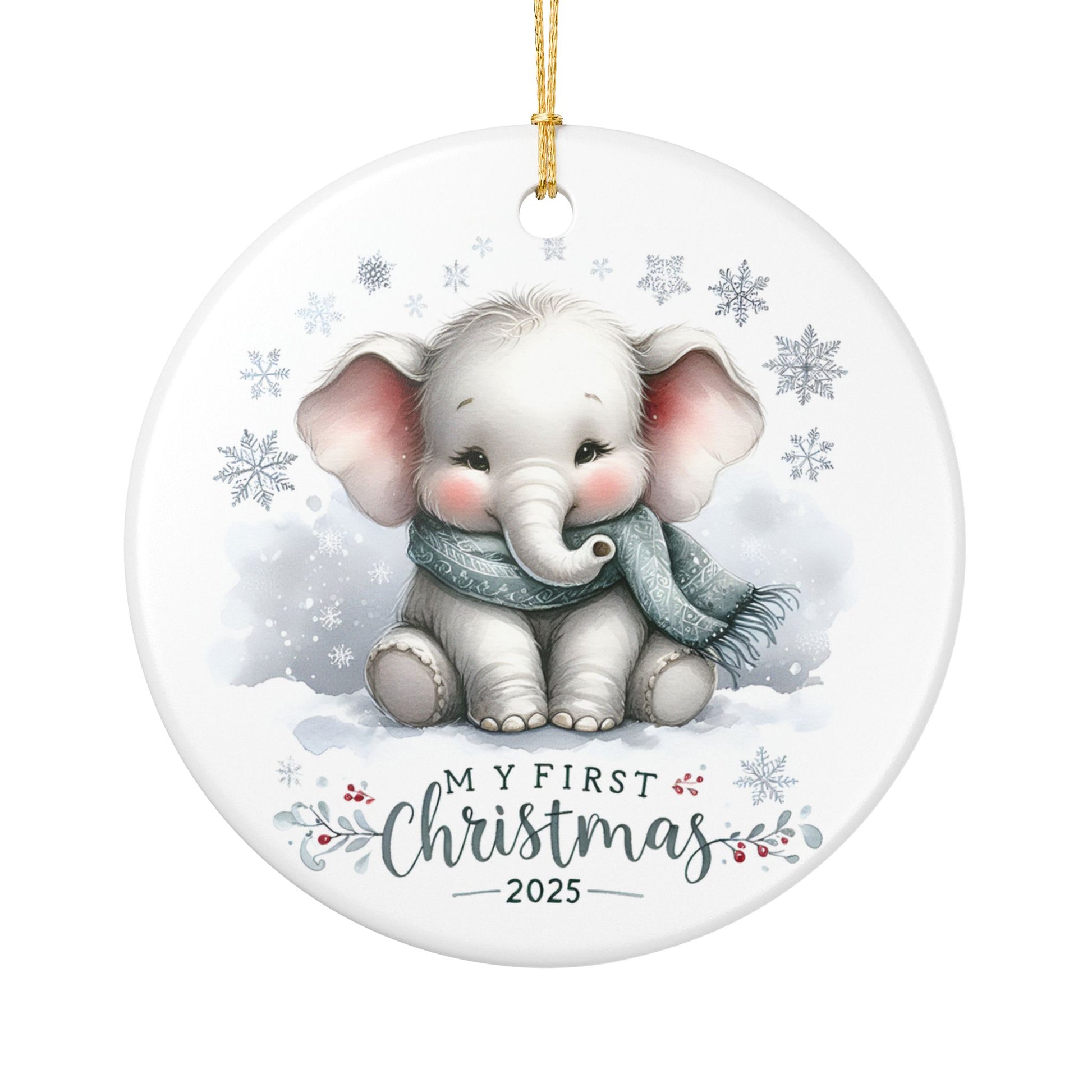 Celebrate your baby’s very first holiday season with this adorable My First Christmas 2025 Elephant Ornament — a sweet keepsake that will melt hearts every year it hangs on your Christmas tree. Featuring a soft watercolor baby elephant wrapped in a cozy scarf surrounded by snowflakes, this ornament is the perfect blend of cute, cozy, and timeless.