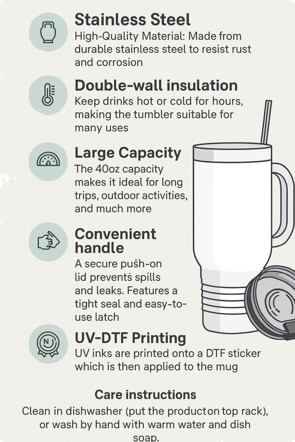 Stay refreshed and stylish with this versatile Insulated Travel Mug, perfect for all your adventures. Designed for people on the go, this mug combines functionality and aesthetic appeal, making it an essential companion for road trips, outdoor excursions, or everyday commutes. With a generous 40oz capacity, it caters to those who crave convenience and hydration. Ideal for coffee lovers, tea enthusiasts, or smoothie sippers alike, it is a fantastic gift for birthdays, holidays, or any celebration. Whether you're hiking in nature or enjoying a picnic in the park, this travel mug elevates your experience with each sip.