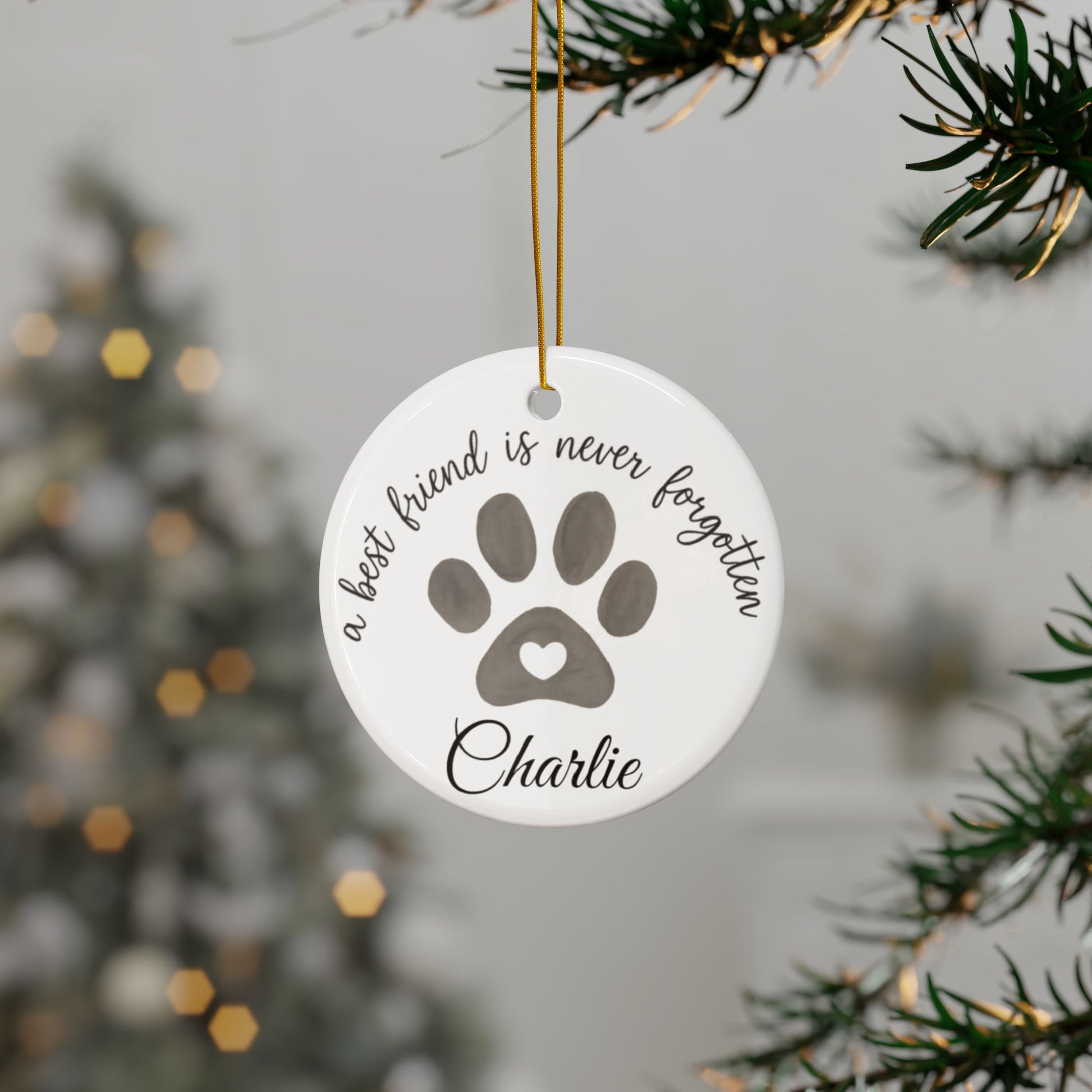 Customized Pet Memorial Ornaments for Dog Lovers, perfect for holiday decorating and as personalized gifts to remember a beloved pet. These double-sided ceramic ornaments feature vibrant colors and glossy finish, with different designs on the front and back. Ideal for those looking to commemorate their pets during the holiday season or as a thoughtful gift for a dog lover.