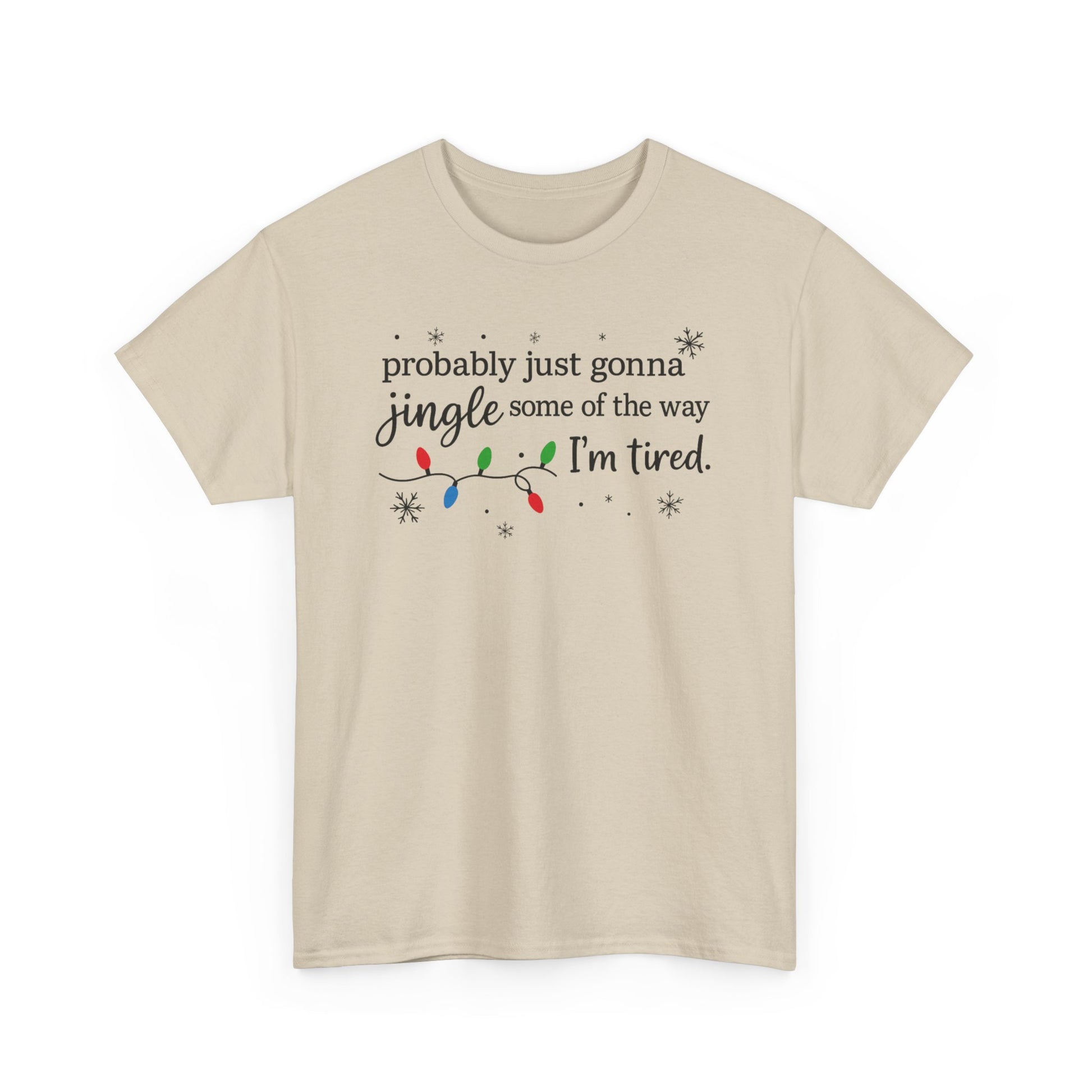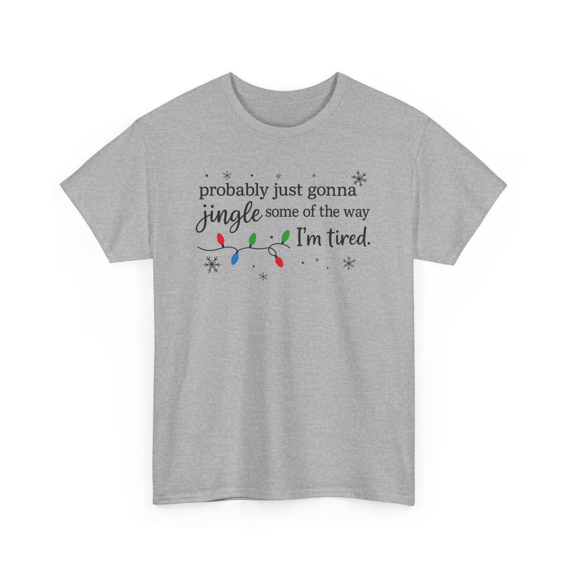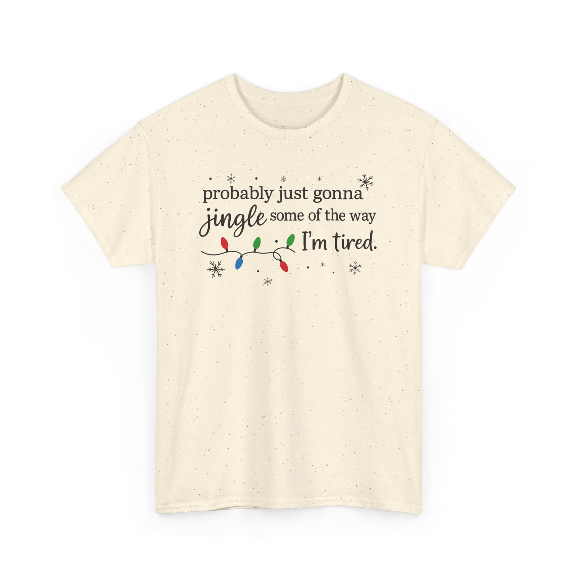 A soft, relaxed holiday tee made for the season of busy schedules, late-night wrapping, and cozy humor. This Christmas shirt features a playful hand-lettered phrase — “Probably Just Gonna Jingle Some of the Way, I’m Tired” — accented with tiny string lights and snowflakes for a subtle festive vibe. Lightweight yet durable, it’s the perfect throw-on for holiday errands, cookie-baking marathons, and family gatherings where comfort matters just as much as cheer.