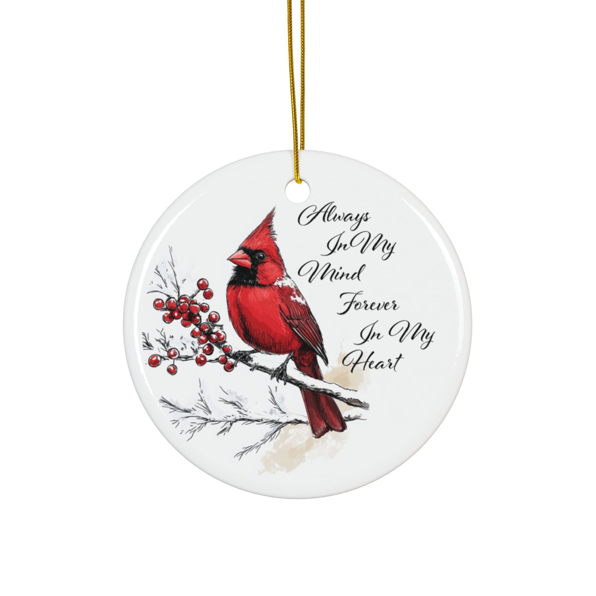 One side features a meaningful memorial sentiment in elegant scripted lettering, while the reverse shows a vibrant red cardinal perched among pine and berries. The glossy ceramic surface enhances every watercolor-like detail, creating a piece that feels both artistic and comforting.