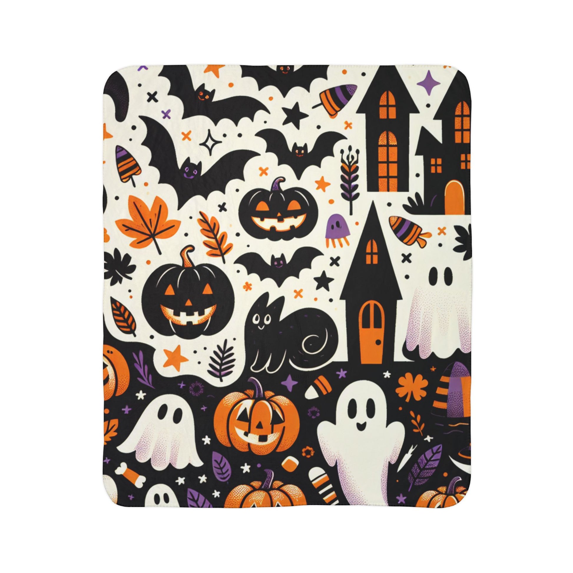 Spooky Season Fleece Sherpa Blanket, Cozy Halloween Decor, Ghosts & Pumpkins Throw Blanket, Autumn Gift, Trick or Treat Sherpa Blanket