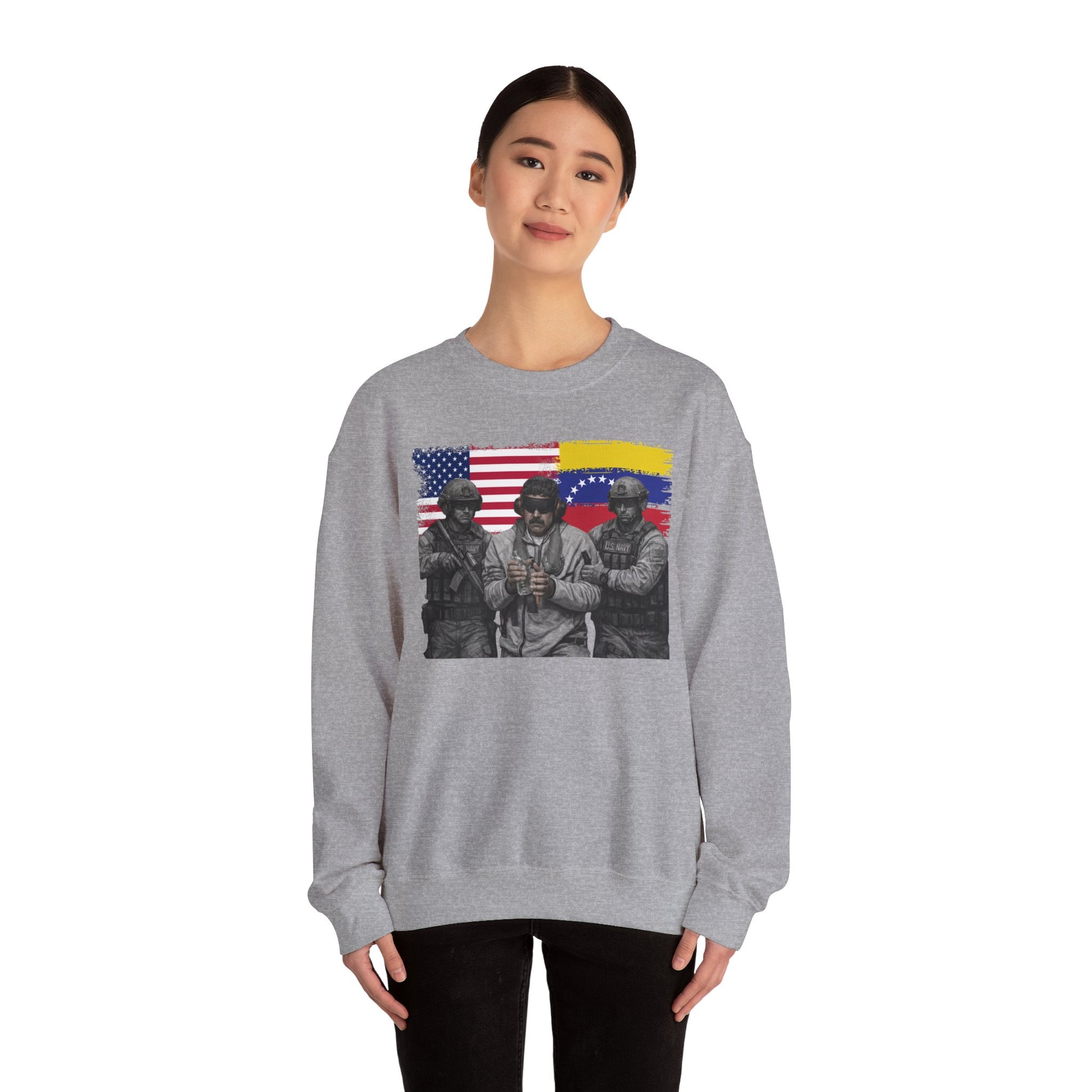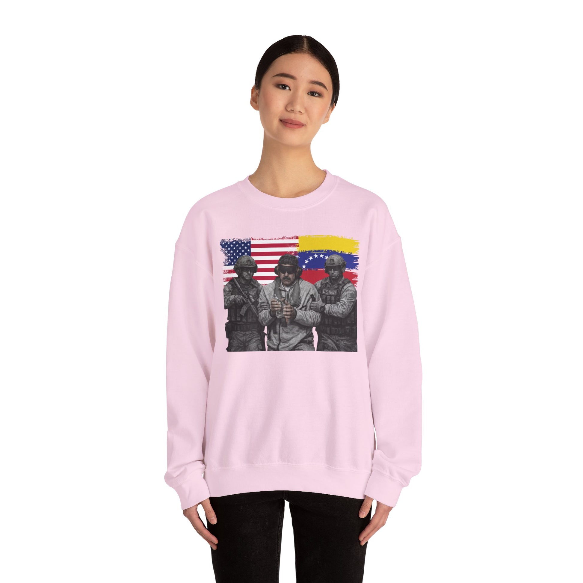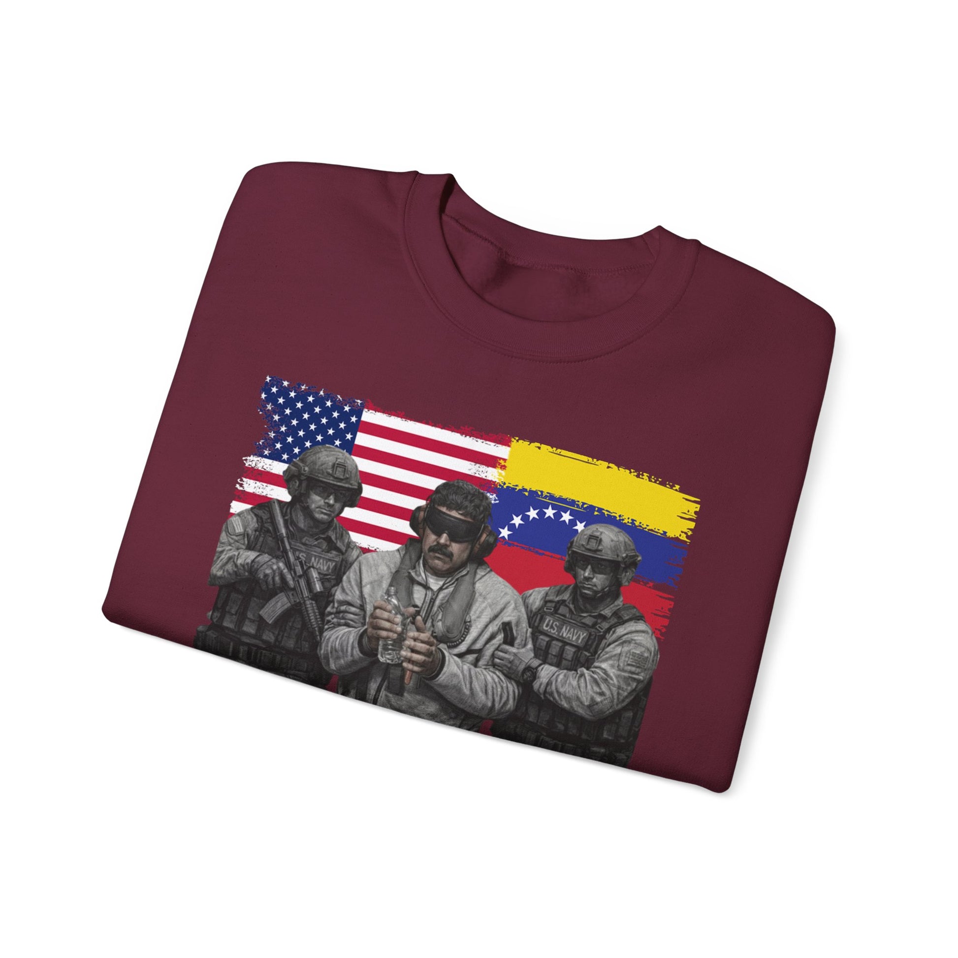 Make a bold visual statement with this Venezuela Freedom graphic t-shirt, featuring a striking illustrated design inspired by global politics and modern street art. The artwork blends symbolic imagery with dramatic detail, creating a powerful conversation piece for those who appreciate political expression, artistic commentary, and statement fashion.